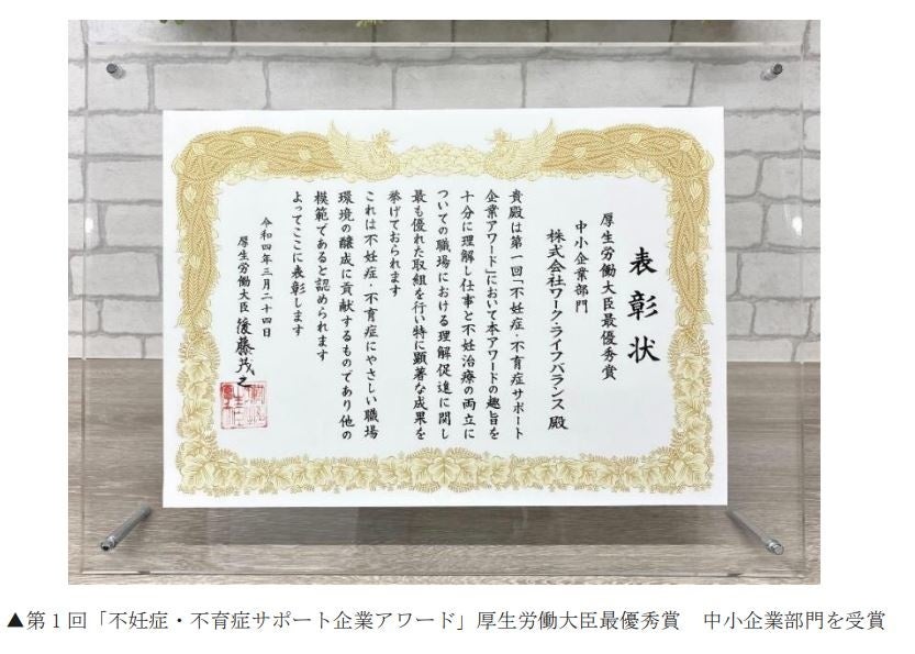 (株)ワーク・ライフバランスが第1回「不妊症・不育症サポート企業アワード」中小企業部門で「厚生労働大臣最優秀賞」を受賞、法定有給休暇に加えて年間36日の「新しい休み」などが高評価