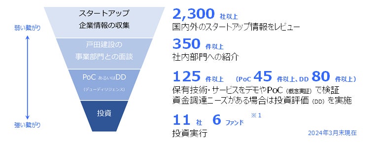 当社では2018年から継続的にスタートアップ企業との価値共創に取り組んでまいりました。これまでに、2,300以上の国内外のスタートアップ企業の情報を収集し、45件以上のPoC(概念実証,トライアル利用も含む)に取り組んでまいりました(図1)。また、2020年からは戦略的リターンと財務リターンを念頭に、スタートアップ企業の資金調達ニーズに対応する投資枠を設け、10社4ファンドへの出資を実行してきました。