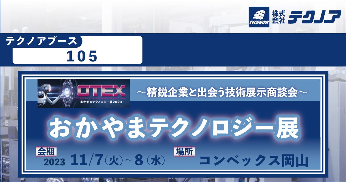 株式会社テクノア(本社:岐阜県岐阜市、代表取締役:山﨑 耕治、以下:テクノア)は、11/7~8 に コンベックス岡山 で開催される 『おかやまテクノロジー展(OTEX)2023』 ~精鋭企業と出会う技術展示商談会~ に出展いたします。