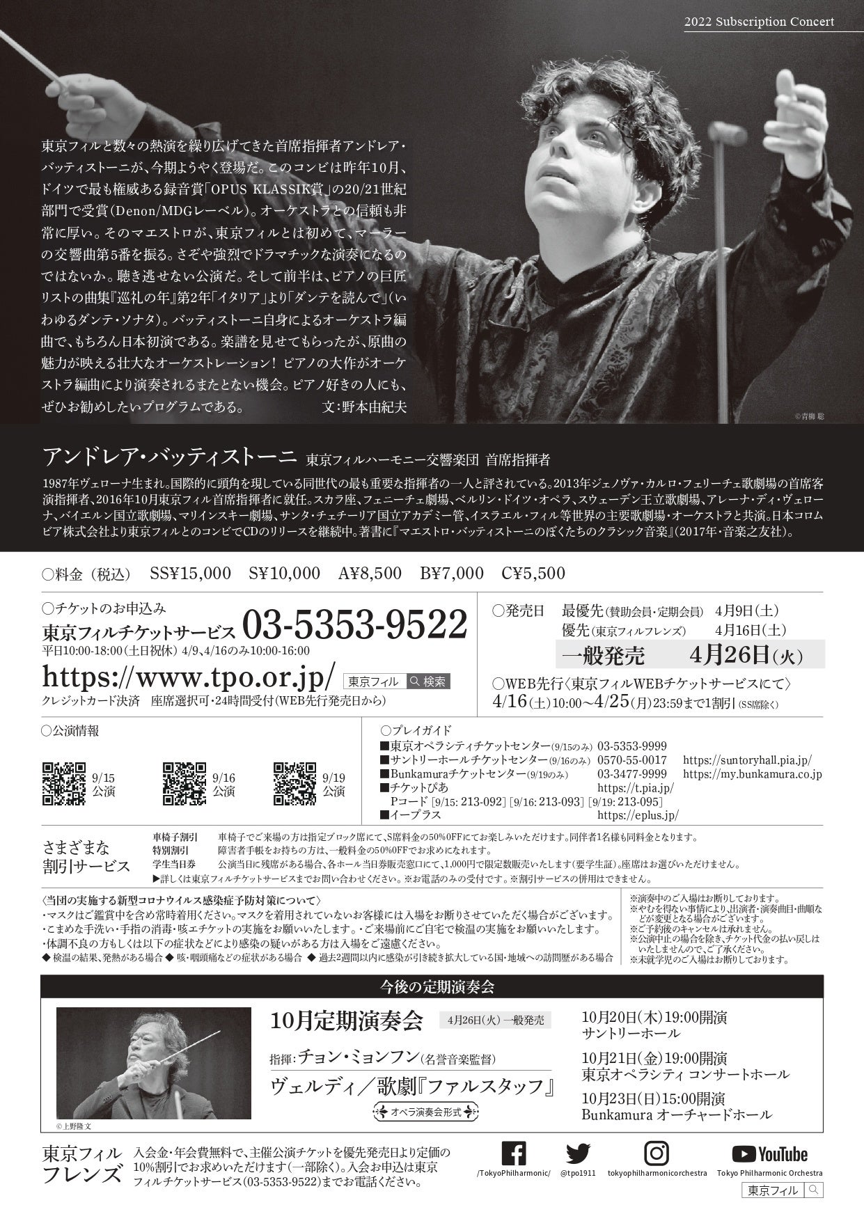 公益財団法人 東京フィルハーモニー交響楽団(東京都新宿区、理事長:三木谷浩史)は、首席指揮者アンドレア・バッティストーニの指揮のもと2022年9月の定期演奏会を9月15日(木)、16日(金)、19日(月・祝)に、同楽団が事業提携を結ぶ新潟県長岡市での特別演奏会を9月18日(日)に開催いたします。