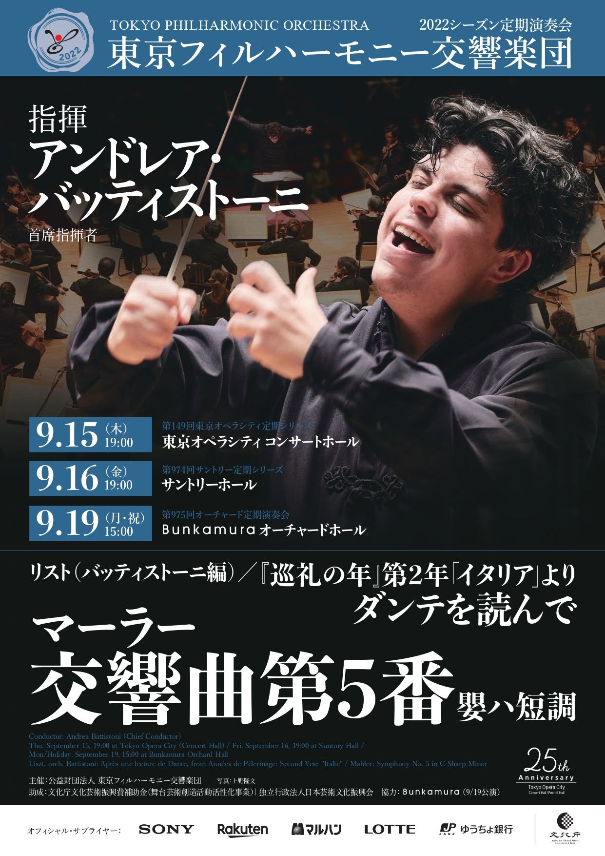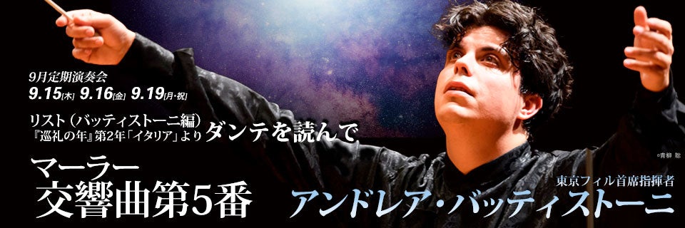 指揮は1987年生まれの東京フィルの若き首席指揮者アンドレア・バッティストーニ。メインプログラムには才気と熱狂、狂おしいほどのカンタービレと爆発的なエネルギーをもつバッティストーニへの待望久しかったマーラー「交響曲第5番」、そしてプログラムの前半には、指揮者自身がオーケストレーション(管弦楽への編曲)を手掛けたフランツ・リストのドラマティックなピアノ作品『巡礼の年』第2年「イタリア」より「ダンテを読んで」を4公演でお届けする。