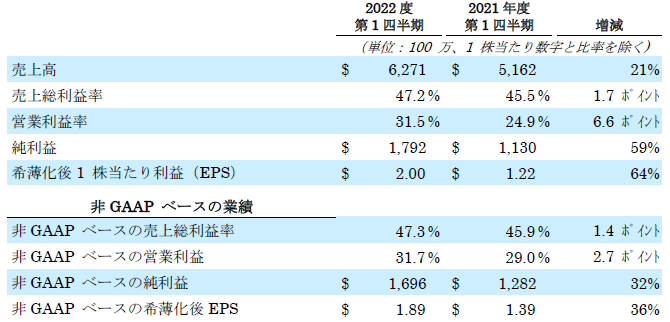非GAAPベースでは、売上総利益率47.3%、営業利益19億9,000万ドル(売上高の31.7%)、1株当たり利益1.89ドルでした。