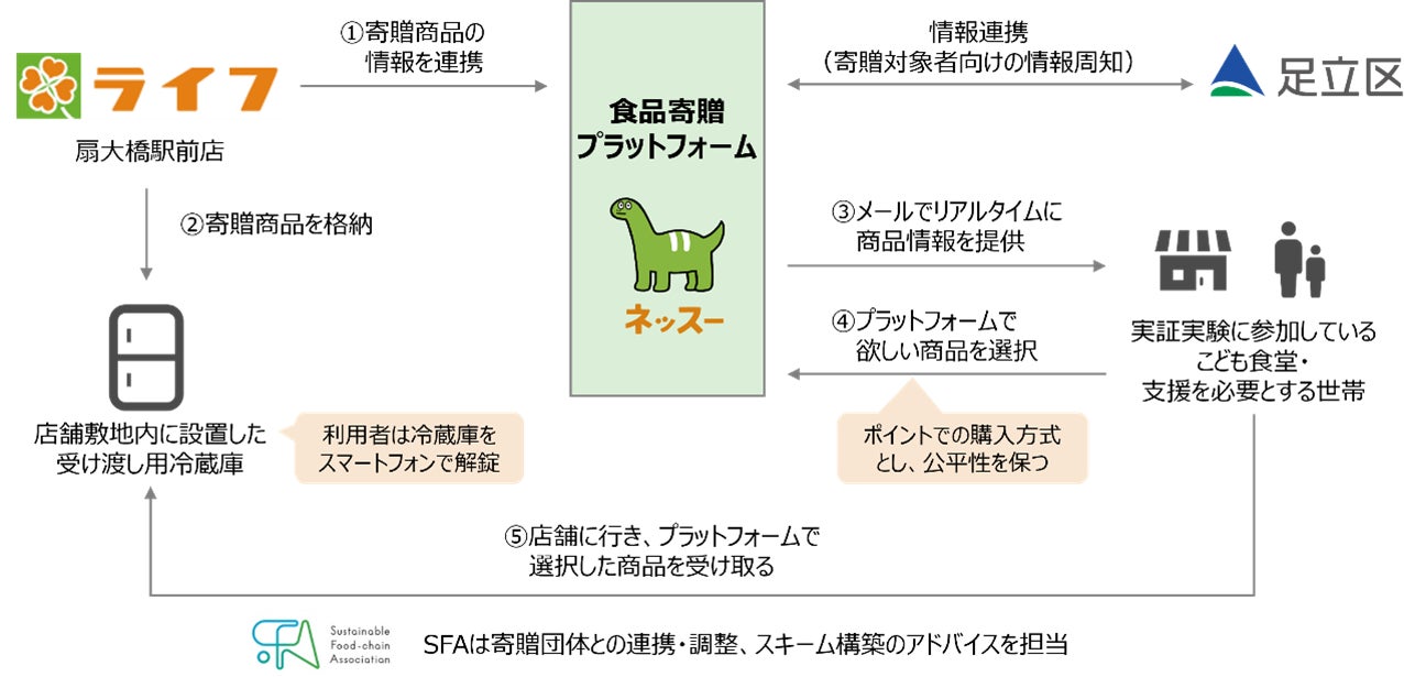 一般社団法人サスティナブルフードチェーン協議会(所在地:東京都千代田区、代表理事:入江満美、以下SFA)が、“おいしい” “ワクワク” “ハッピー” をお届けする株式会社ライフコーポレーション(本社:東京都品川区、代表取締役社長執行役員:岩崎 高治)および、こどもの機会格差の解消を目指すネッスー株式会社(本社:東京都世田谷区、代表:木戸優起)と連携し実施をした、農産品(野菜・果物)・日配食品寄贈モデルの実証実験が終了いたしました。