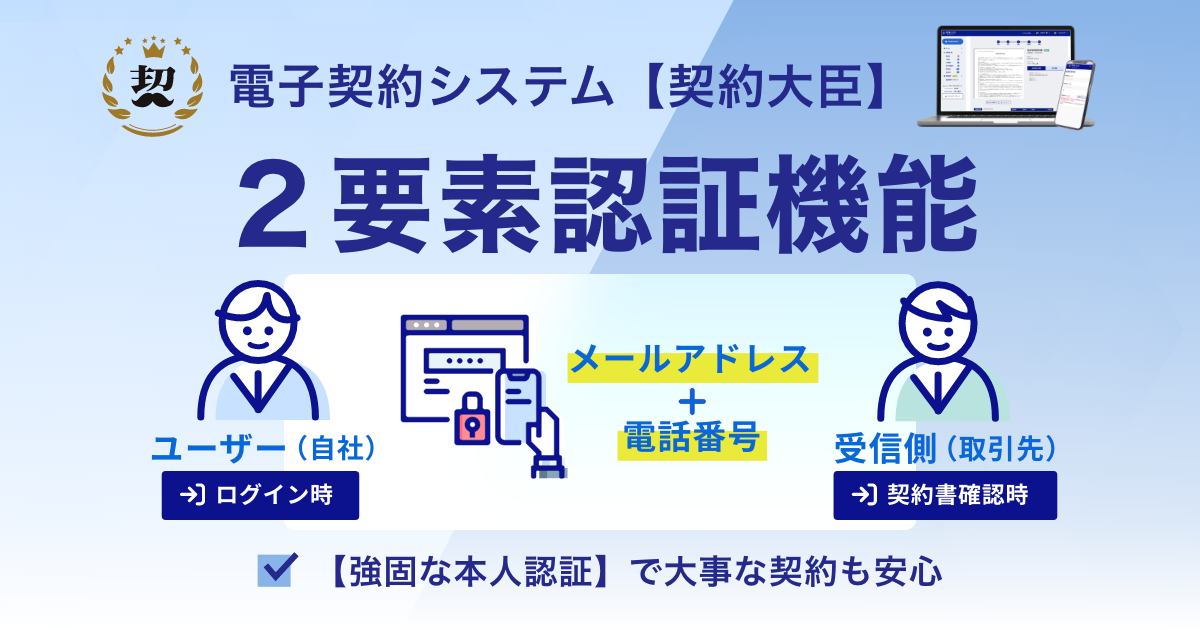 株式会社TeraDox(本社:東京都渋谷区、代表取締役:齋藤 啓司)は、電子契約システム『契約大臣』にて、ログインユーザーが本人であることの信頼性を高める、2要素認証機能(Eメール+電話)の提供を開始いたしました。