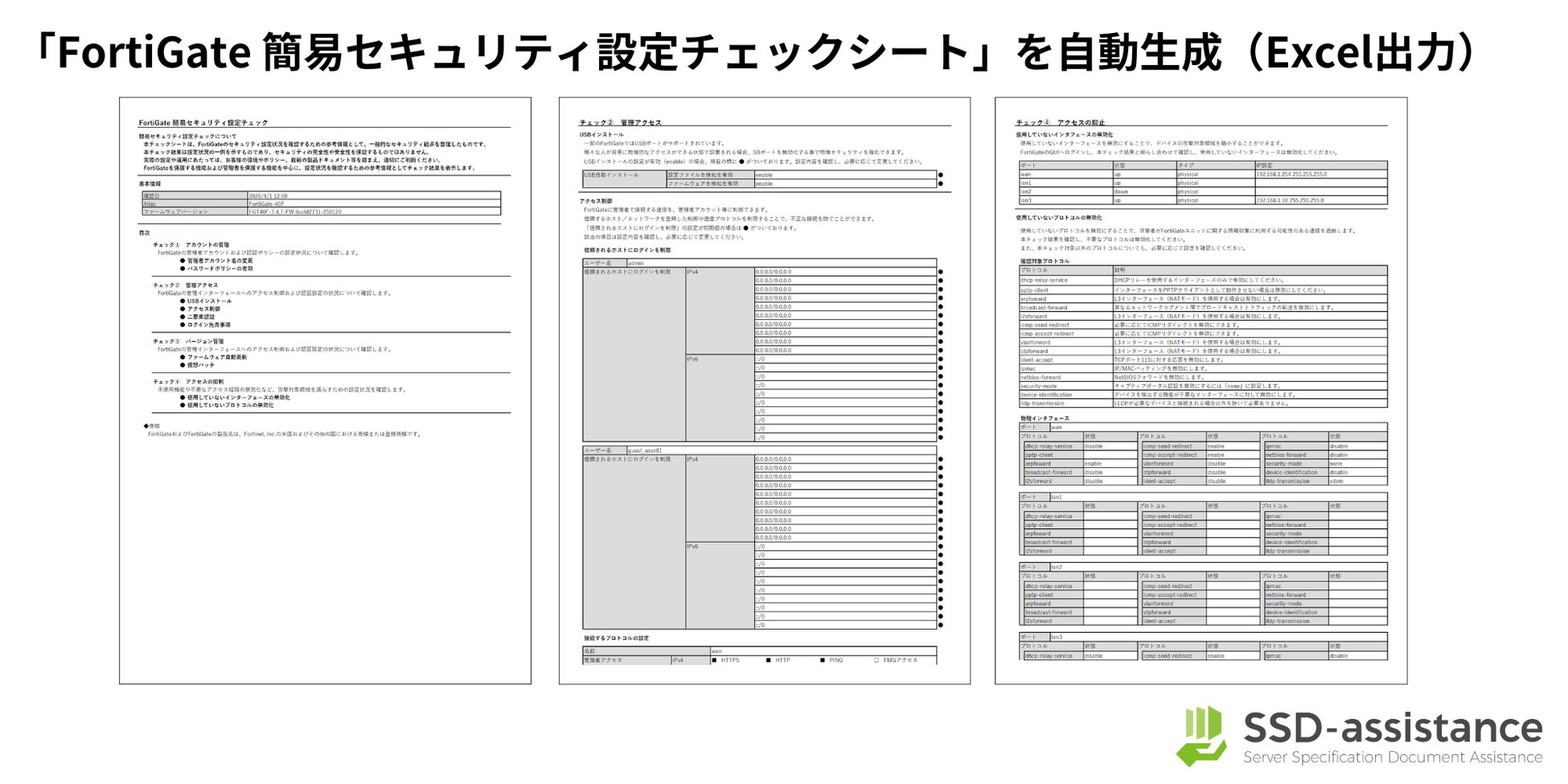 セイ・テクノロジーズ株式会社 (本社:東京都文京区、代表取締役社長:三瓶 千里、以下「セイ・テクノロジーズ」) は、累計 500 社以上に導入され、継続率 97% 以上を維持しているサーバー設定仕様書自動生成サービス「SSD-assistance(以下「SSDA(エスダ)」)」をバージョンアップし、新たに FortiGate の FortiOS 7.6 及び「FortiGate 簡易セキュリティ設定チェックシート」の生成機能を追加したことを発表します。