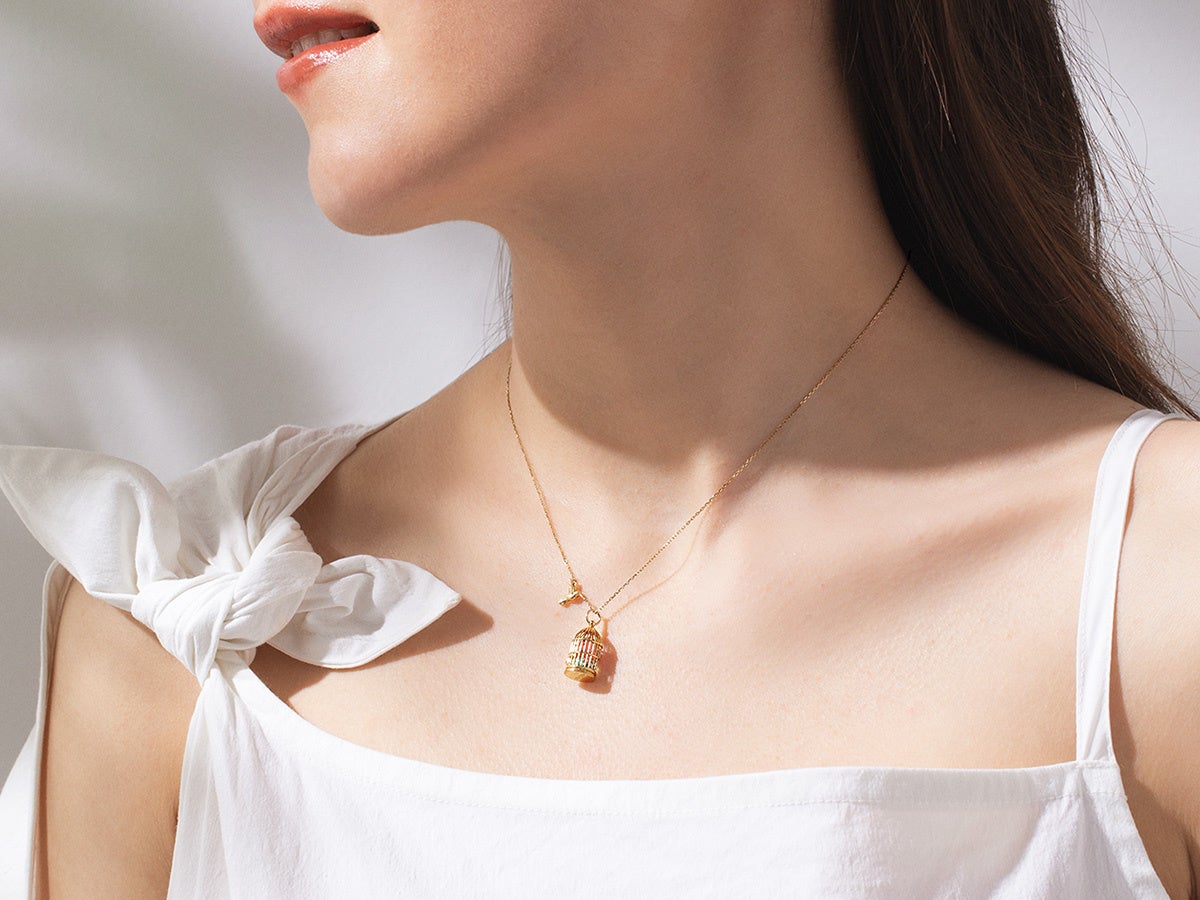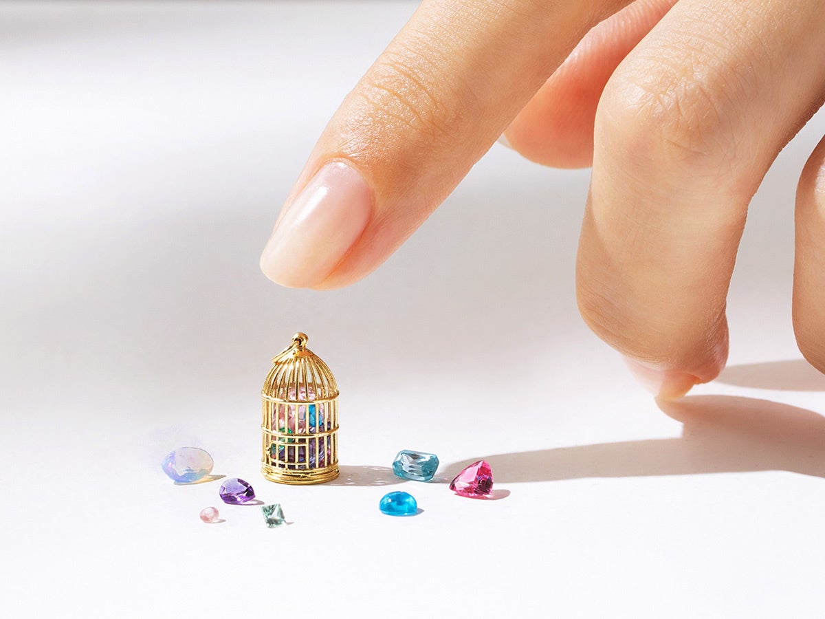 ドネーションの対象となるアイテムは、ジェムエデンの人気アイテム「toricago(トリカゴ)」。精巧なゴールド製の鳥かごの中に、これまでジュエリーに使われることなく宝石ロスとなっていた7石の宝石を閉じ込めたペンダントトップです。