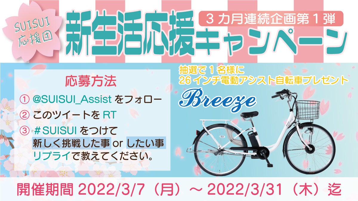 その名も【SUISUI応援団新生活応援キャンペーン】!キャンペーン内容は第1弾~第3弾に分けて3ヶ月連続で電動アシスト自転車をプレゼント、と新生活のはじまりを祝う豪華な施策となっています。