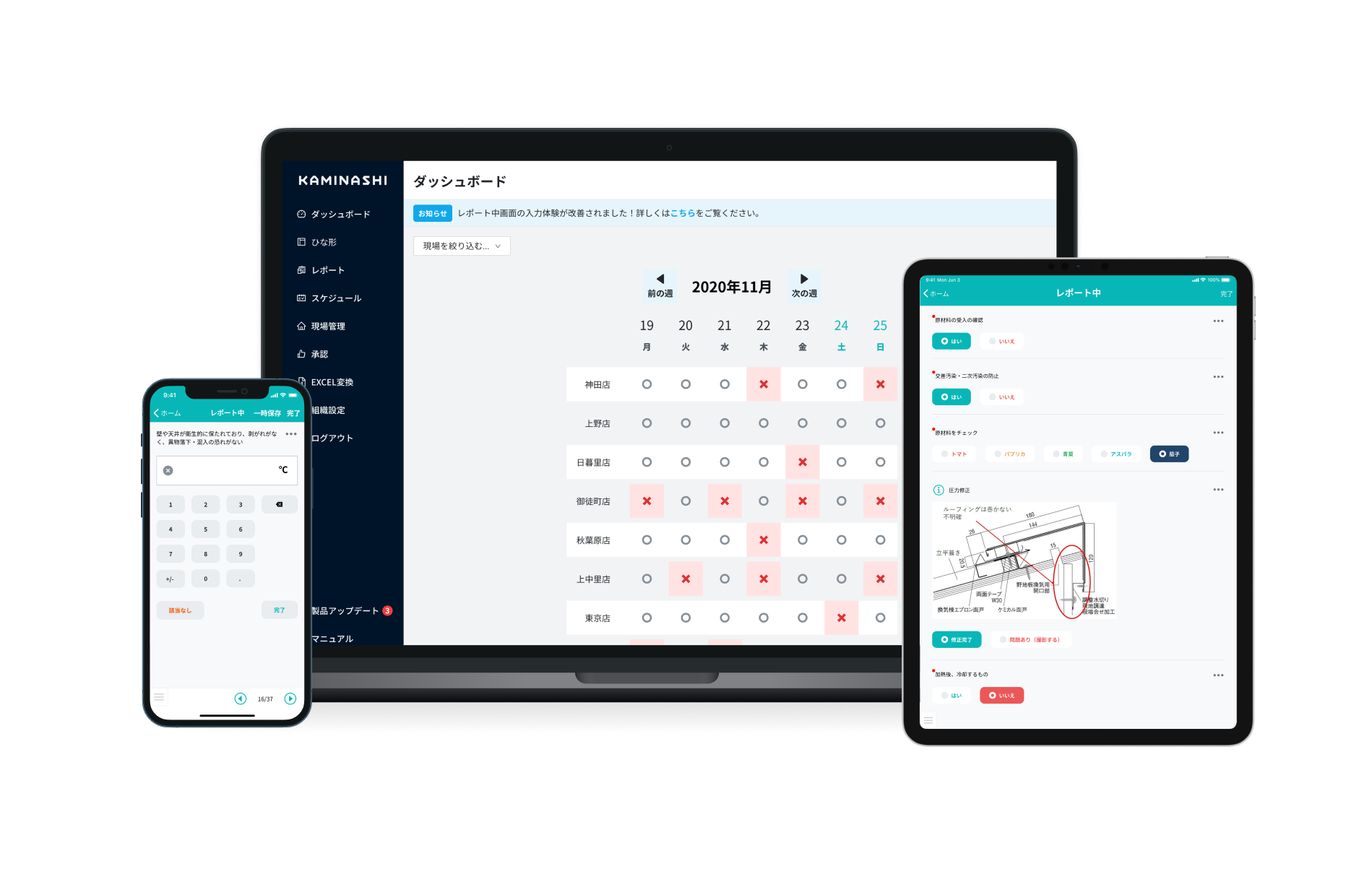 カミナシが提供する現場DXプラットフォーム『カミナシ』は、工場や店舗で日々行われる点検・作業記録などの現場管理業務をノーコードでつくったアプリで入力から一元管理できる業務効率化ツールです。手書き情報のデータ化から集計、報告書作成など、これまで紙やエクセルで行っていた業務をデジタル化することで、ペーパーレスのみならず、正しい作業手順の徹底から業務改善まで実現。2020年6月末の提供開始以来、これまでに製造や飲食、小売、物流など、業界問わず180社以上の現場DXを推進しています。利用料金は以下よりお問い合わせください。