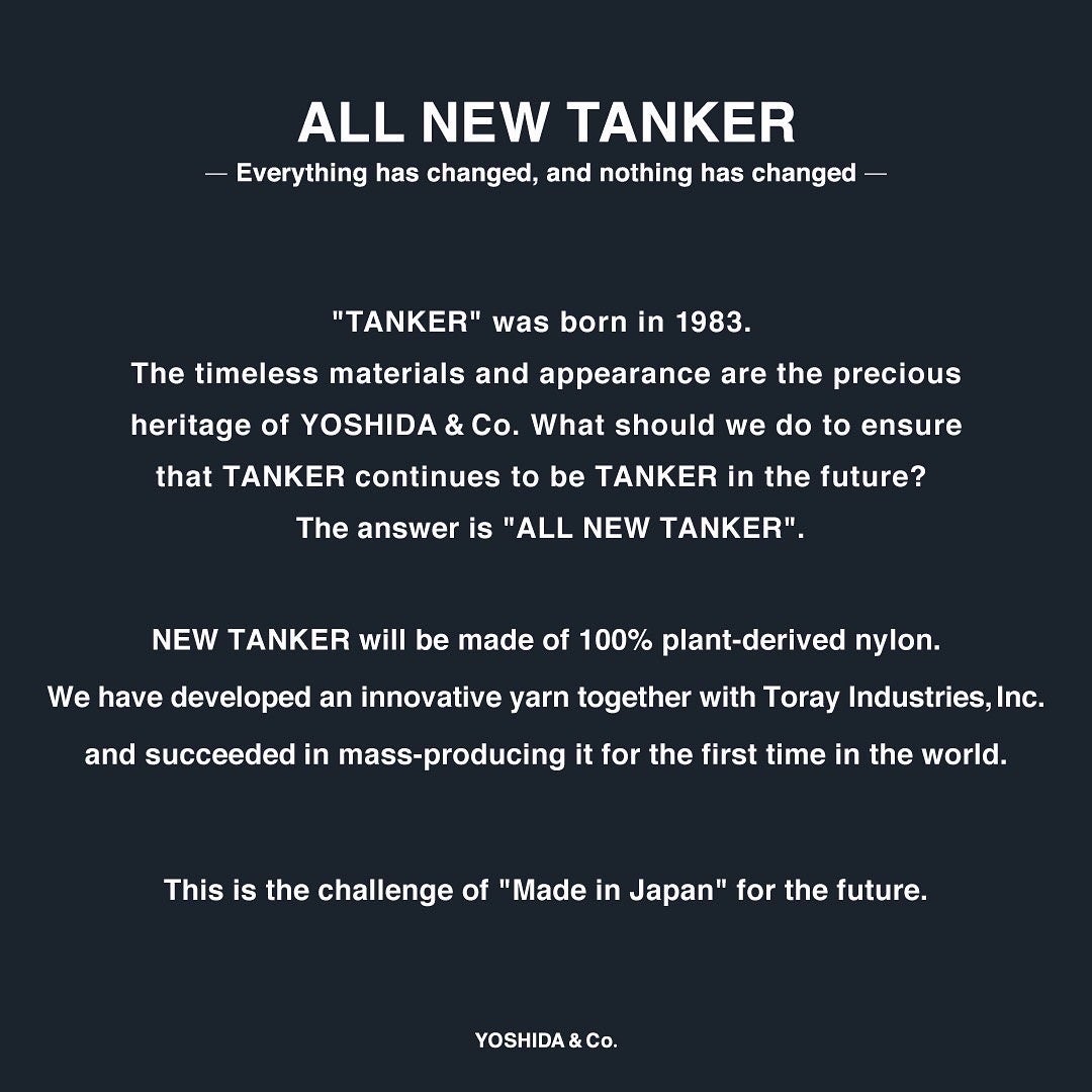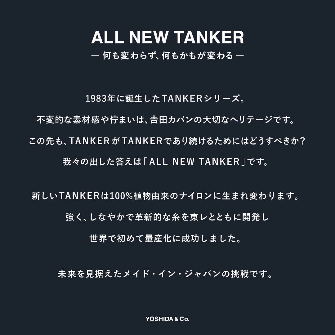 TANKERは「100%植物由来」の⾰新的なナイロンにより新しく⽣まれ変わりました。