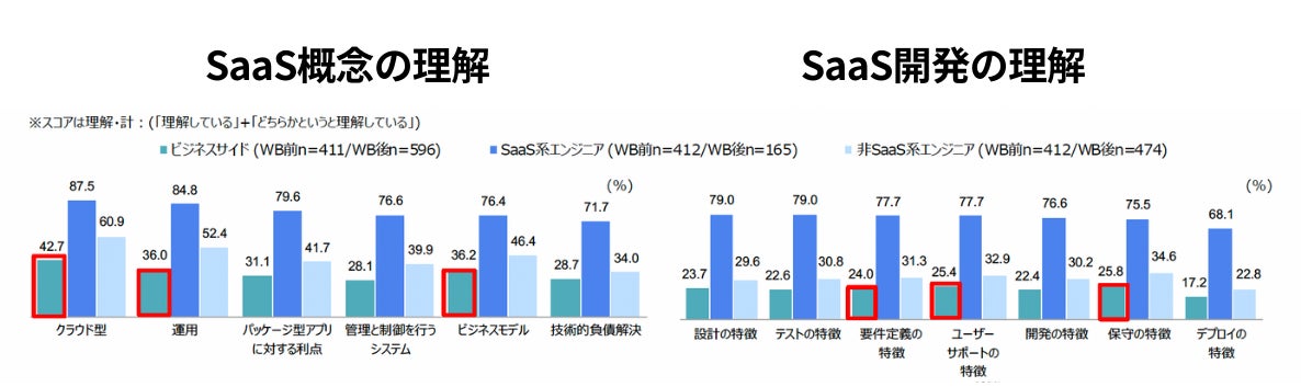 しかし、SaaSに対する理解度は、「概念理解」「開発理解」ともにビジネスサイドよりもSaaS系エンジニアの方が高いという結果になり、エンジニアとビジネスサイドでは理解度に乖離が存在していることも明らかになっています。
