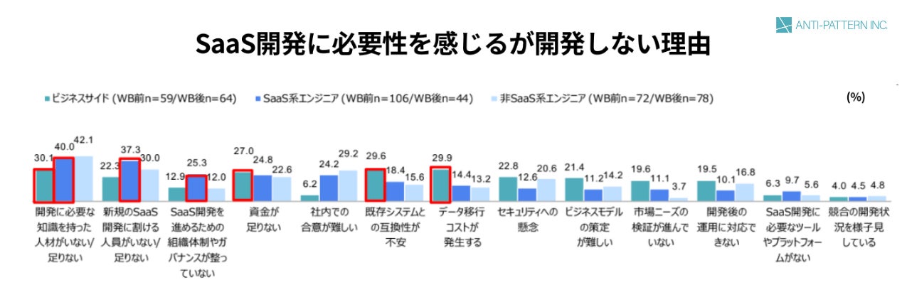 理由としては、「開発に必要な知識を持った人材がいない/足りない」がいずれの職種でも最も高いことが分かりました。次いで、SaaS系エンジニアでは「新規のSaaS開発に割ける人員がいない/足りない」「SaaS開発を進めるための組織体制やガバナンスが整っていない」が上位に挙がる一方で、ビジネスサイドは「データ移行コストが発生する」「既存システムとの互換性が不安」「資金が足りない」が上位に挙がりました。