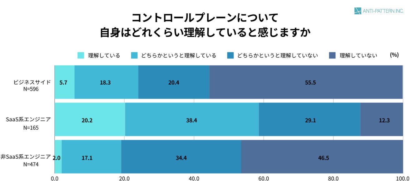 SaaS自体の運用や管理・サポートをする機能群である「コントロールプレーン(*)」の理解度については、ビジネスサイドが24.0%、SaaS系エンジニアが58.6%とこちらもSaaS系エンジニアの方が高い結果となりましたが、SaaS系エンジニアでも約4割はコントロールプレーンへの理解が不十分という現状があることが分かりました。