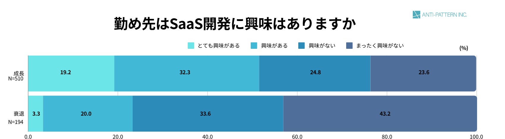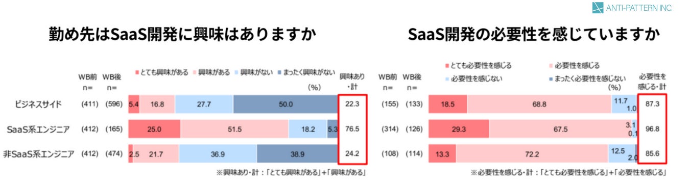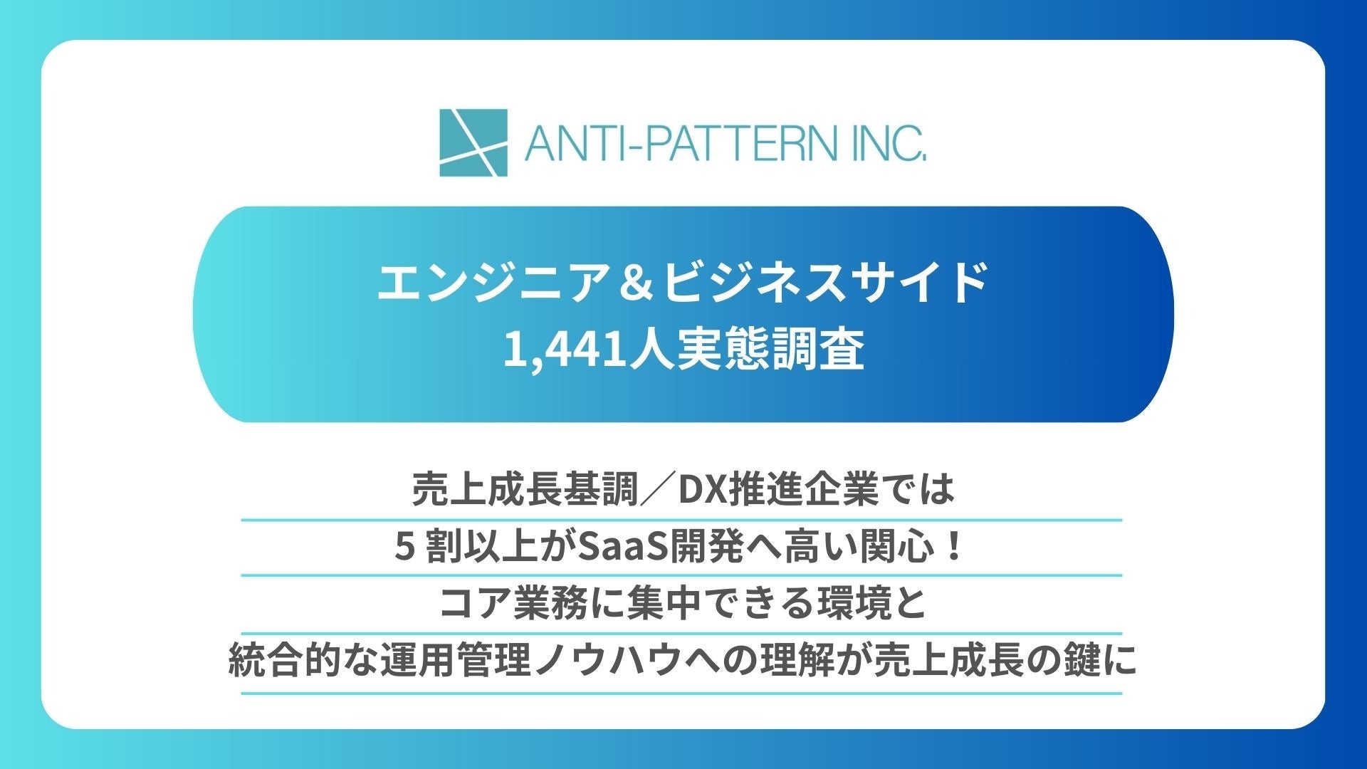 「日本のソフトウェアエンジニアを憧れの職業へ」を理念に掲げる株式会社アンチパターン(本社:東京都港区、代表取締役 小笹 佑京、以下当社)は、2024年6月6日~6月11日、SaaSを認知している経営者・経営企画・Bizdev、SaaS系エンジニア、非SaaS系エンジニアの方1,441名を対象にSaaSに対する理解や興味、課題に関するアンケート調査を実施したことをお知らせします。