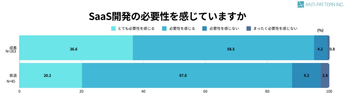 また、SaaSに興味を持つ企業の中で「SaaS開発の必要性を感じている」と回答した方の割合は、成長基調にある企業が95.1%、そうでない企業が88.0%といずれも高い割合の方がSaaS開発の必要性を感じていることが分かっています。