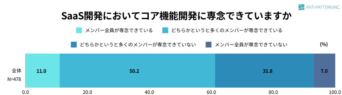 「SaaS開発において、コア機能開発に専念できていますか」という設問について、「メンバー全員が専念できている/どちらかというと多くのメンバーが専念できている」と回答した割合が61.2%、「どちらかというと多くのメンバーが専念できていない/メンバー全員が専念できていない」の割合が38.8%という結果になっており、SaaS開発を行っている企業の内、コア機能開発に専念できている企業は約6割に留まることが明らかになりました。