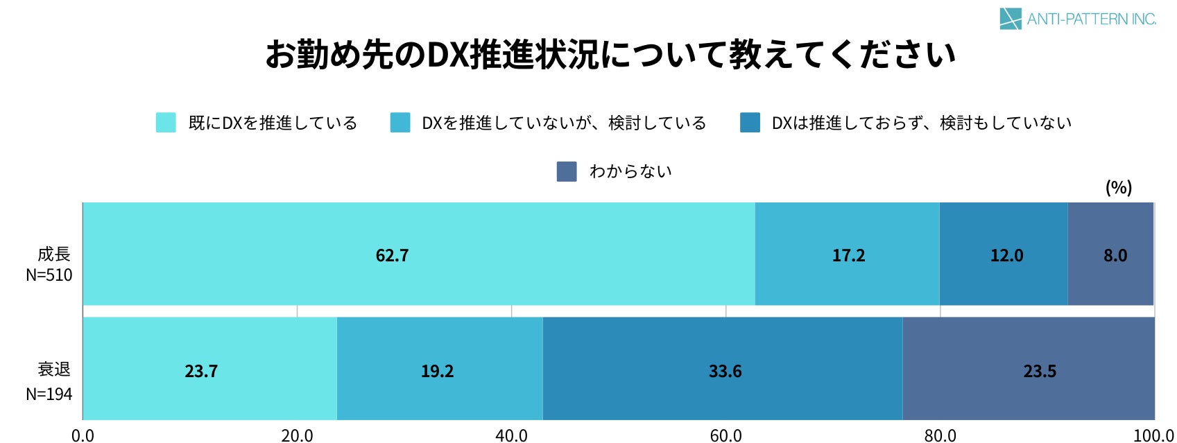 また、「勤め先のDX推進状況」に関しては、「既にDXを推進している/DXを推進していないが、検討している」と回答した割合が、成長基調にある企業が80.0%、そうでない企業が42.9%となっており、DXを推進している企業の方が売上が成長基調であることが明らかになりました。