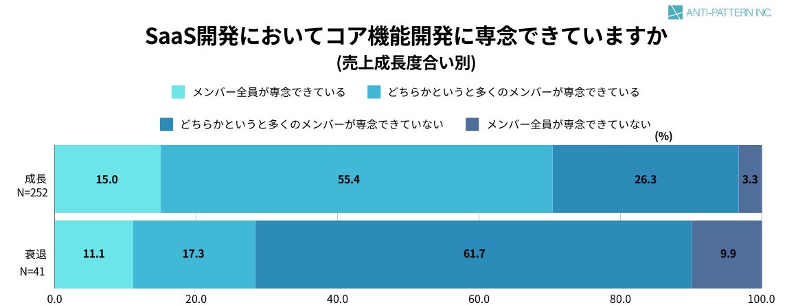 加えて、SaaS開発において「コア機能開発に専念できている」と回答した方の割合は、成長基調にある企業が70.4%、そうでない企業が28.4%となっており、コア機能開発に専念できている企業の方が売上が成長基調であることが分かりました。