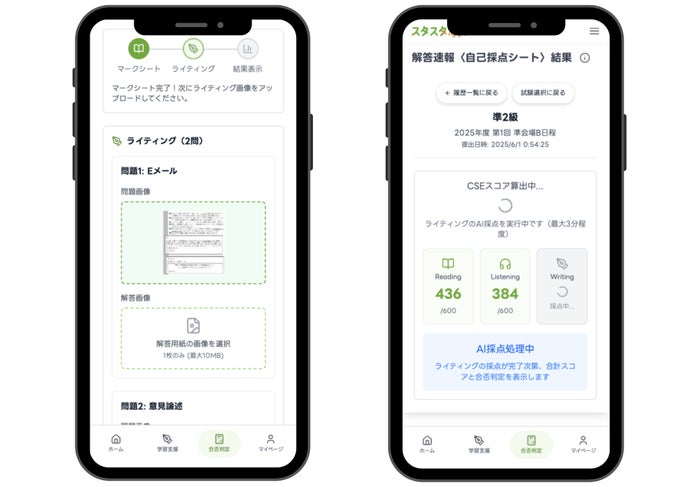 スタスタAppsの「解答速報〈自己採点シート〉」は、英検®一次試験の解答速報をもとに、Reading/Listening/Writingをまとめて自己採点できる無料機能です。Reading/Listeningは選択肢入力で採点、Writingは解答をアップロードして採点し、CSEスコア推定や合否の目安を確認できます。