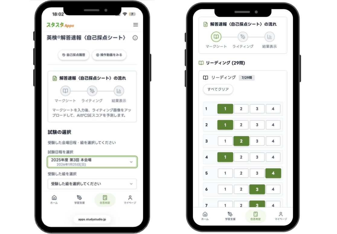 英検®対策Webアプリ「スタスタApps」(運営:スタディスタジオ株式会社)は、英検®2025年度第3回一次試験の解答速報に対応し、本会場および準会場D/E/F日程の解答速報(2026年1月26日(月)13:00以降に協会公式サイトへ掲載予定)について、掲載を確認後、解答速報〈自己採点シート〉へ順次反映します。