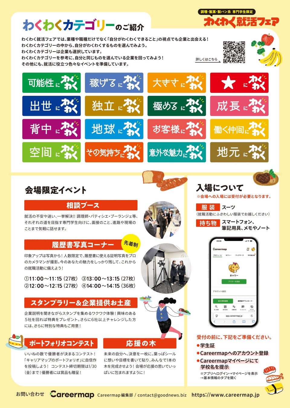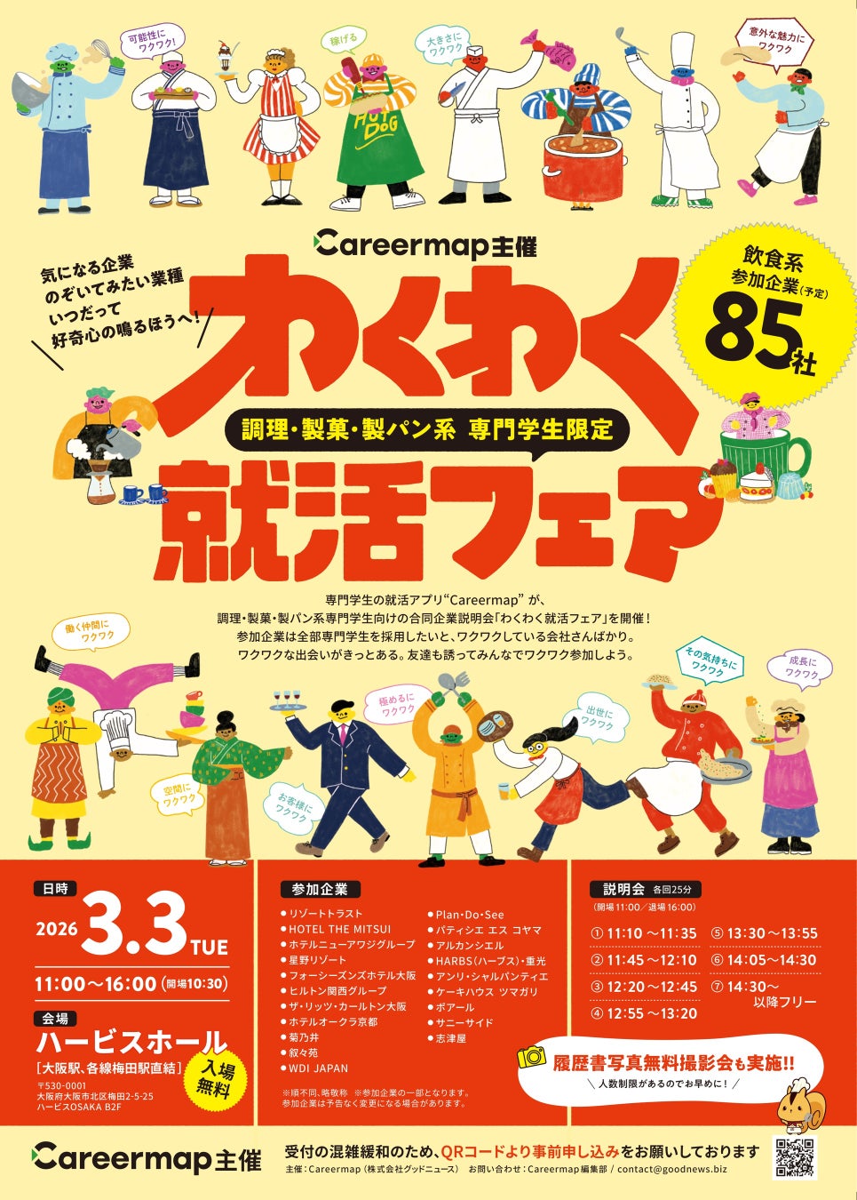 専門学生向け就活アプリ「Careermap」を開発・運営する株式会社グッドニュース(本社:大阪市北区、代表取締役社長:杉岡 充敏)は、調理・製菓・製パン系専門学生を対象とした合同企業説明会『わくわく就活フェア』を、2026年3月3日(火)に大阪・ハービスホールにて開催いたします。