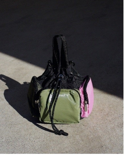 カラーブロックの配色がアクセントのフォルムがかわいらしい巾着型のショルダーバッグ。小ぶりながら十分なマチがあり、見た目以上の収納力がポイント。外側には小物の仕分けに便利な3つのポケット付き。取り外し・長さ調整可能なストラップにより2WAYでご使用いただけます。
