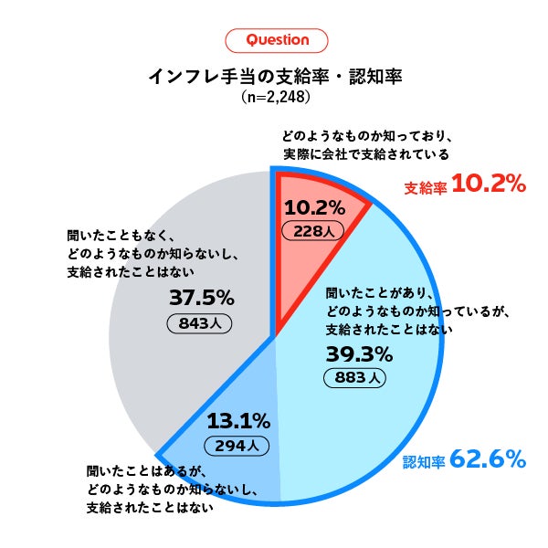 全国20~50代の正社員2,248名を対象に「インフレ手当」を支給率・認知率を調査したところ、支給されたと回答した人は、1割以上(10.2%)に、また「インフレ手当」を聞いたことがあると回答した人は62.8%と、認知率は6割以上に上っていることが明らかになりました。