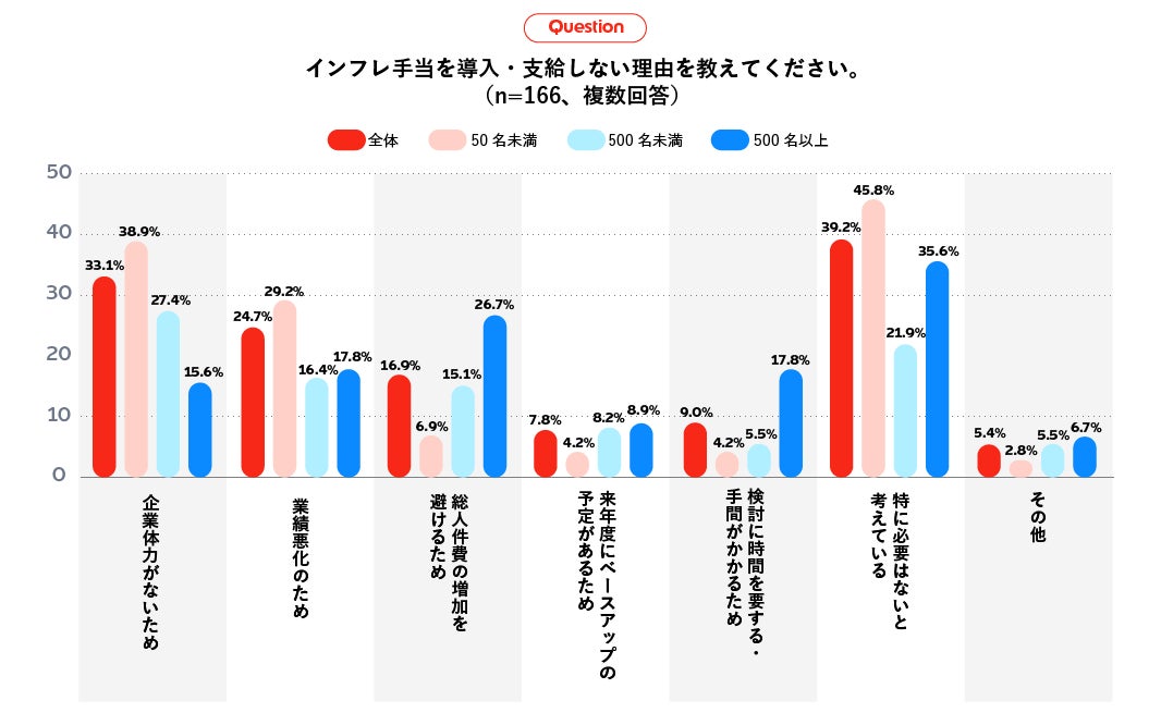 「インフレ手当」を支給していないと回答した166名を対象に、支給しない理由を聞いたところ、最多は「特に必要ない」(39.2%)、続いて「企業体力がないため」(33.1%)、「業績悪化のため」(24.7%)となりました。特に、50名未満規模の企業ではその傾向が強く、企業規模によって「支給したくてもできない」企業が一定数いることがうかがえる結果に。対して500名以上規模の企業は、約3割が「総人件費の増加を避けるため」と回答しており、コストにシビアな傾向が見られました。