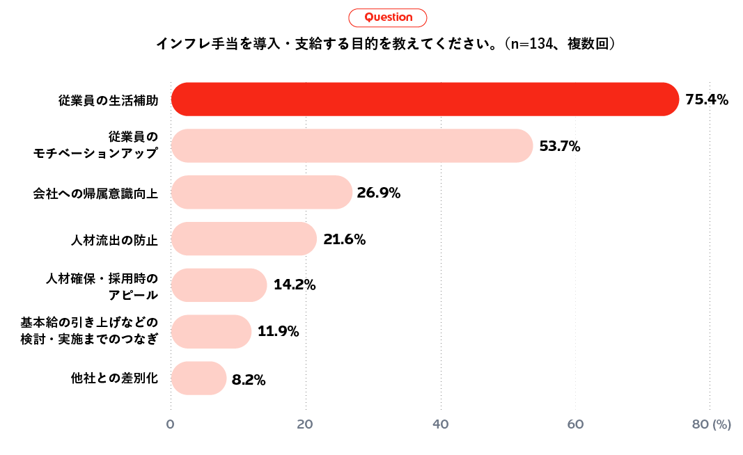 ■「インフレ手当」の支給目的、1位は「従業員の生活補助(75.4%)」で約8割と最多。