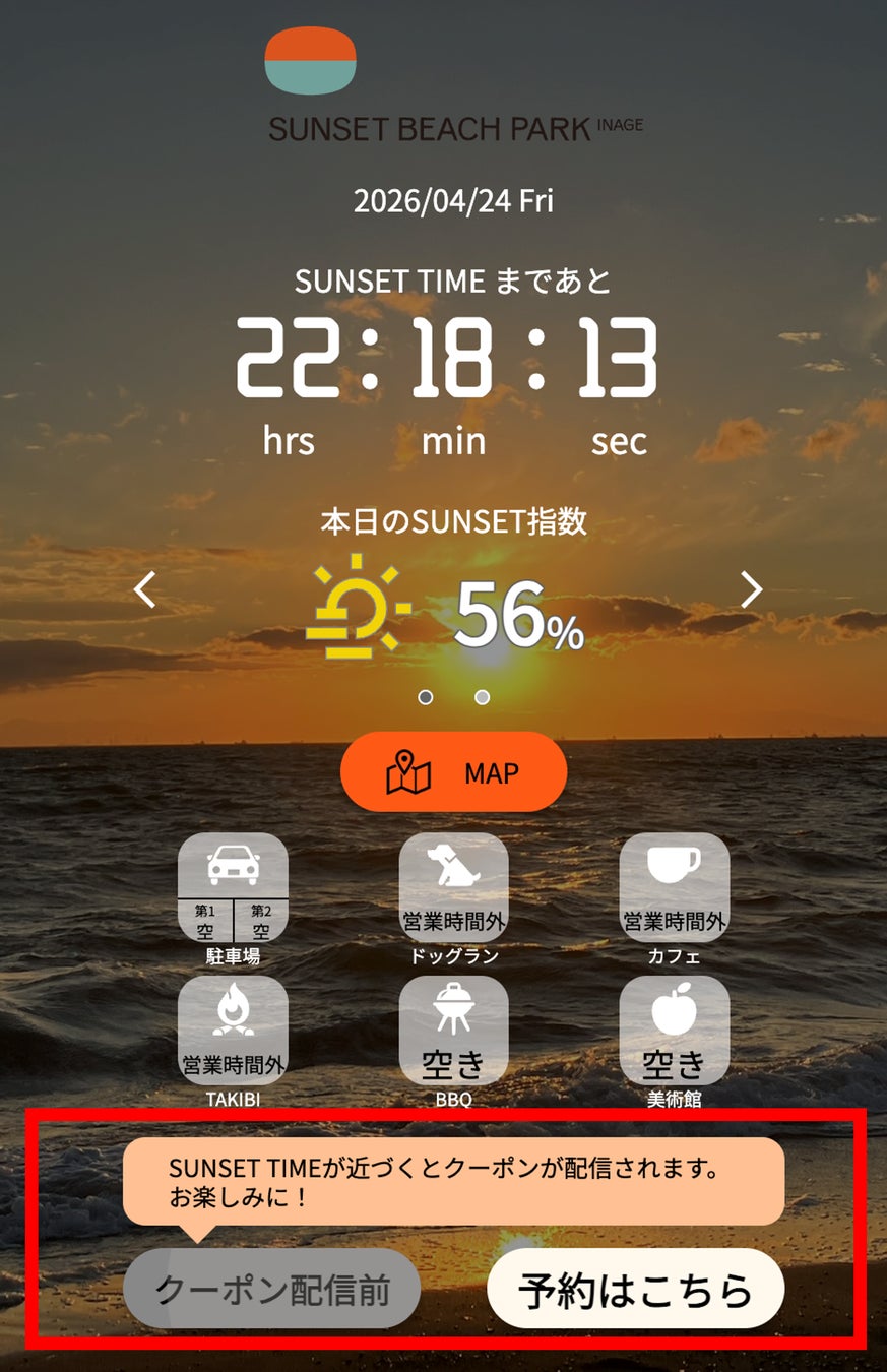 稲毛海浜公園、デジタルマップ「SUNSET BEACH MAP」に今日の夕日の美しさを数値化した“SUNSET指数”機能を新搭載!