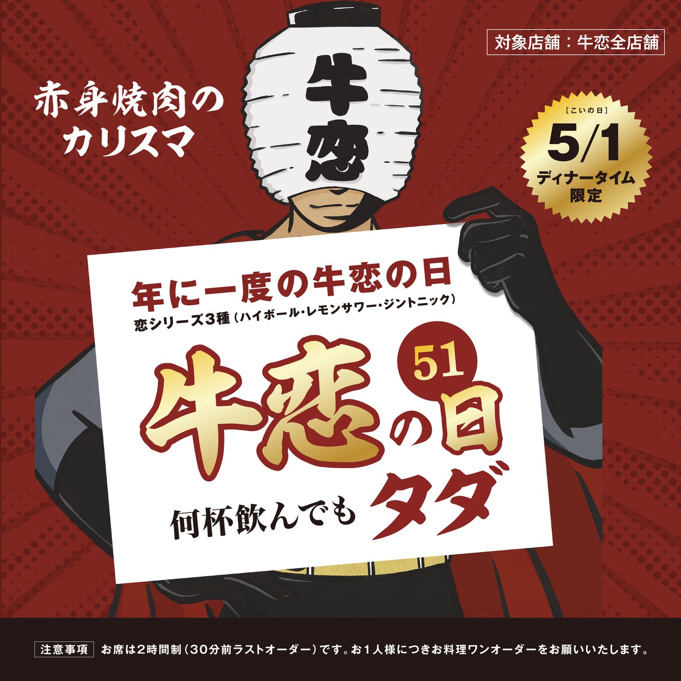 「5/1牛恋の日」限定。GW中も、お客様への感謝を込めた大還元祭。