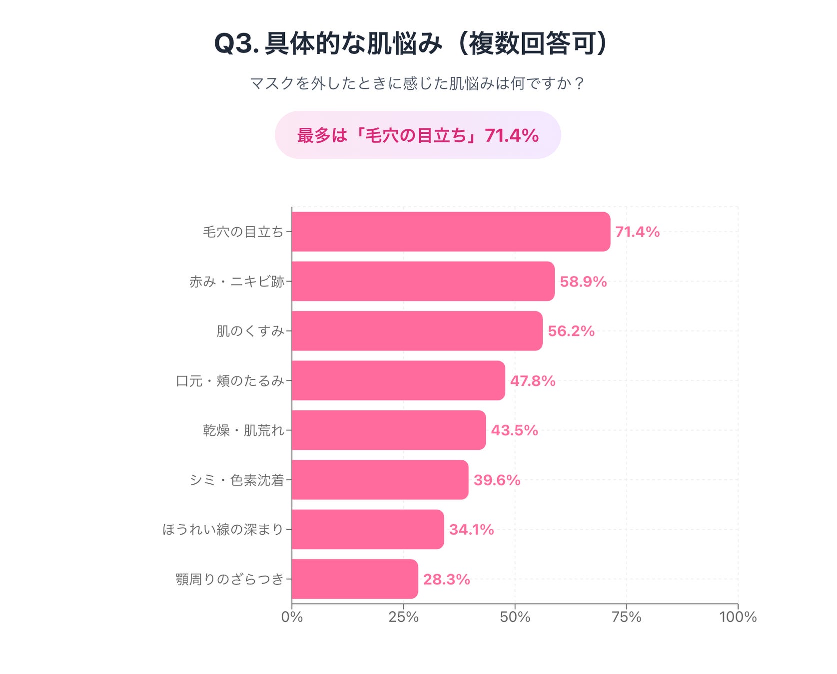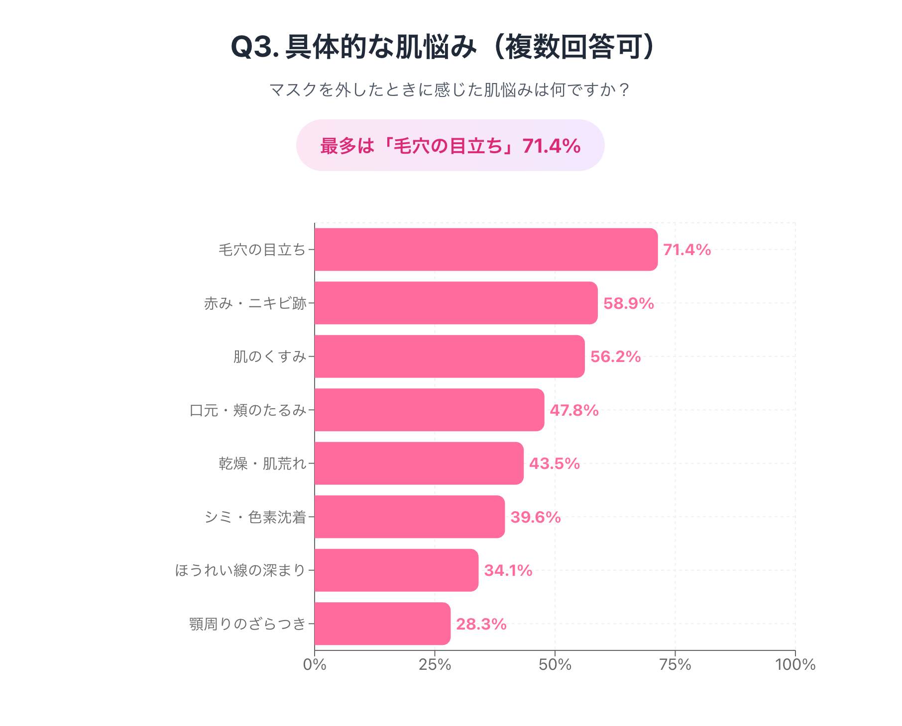マスクによる摩擦や蒸れ、長期間隠れていたことで放置されていた肌悩みが、マスクオフとともに一気に表面化した様子がうかがえます。