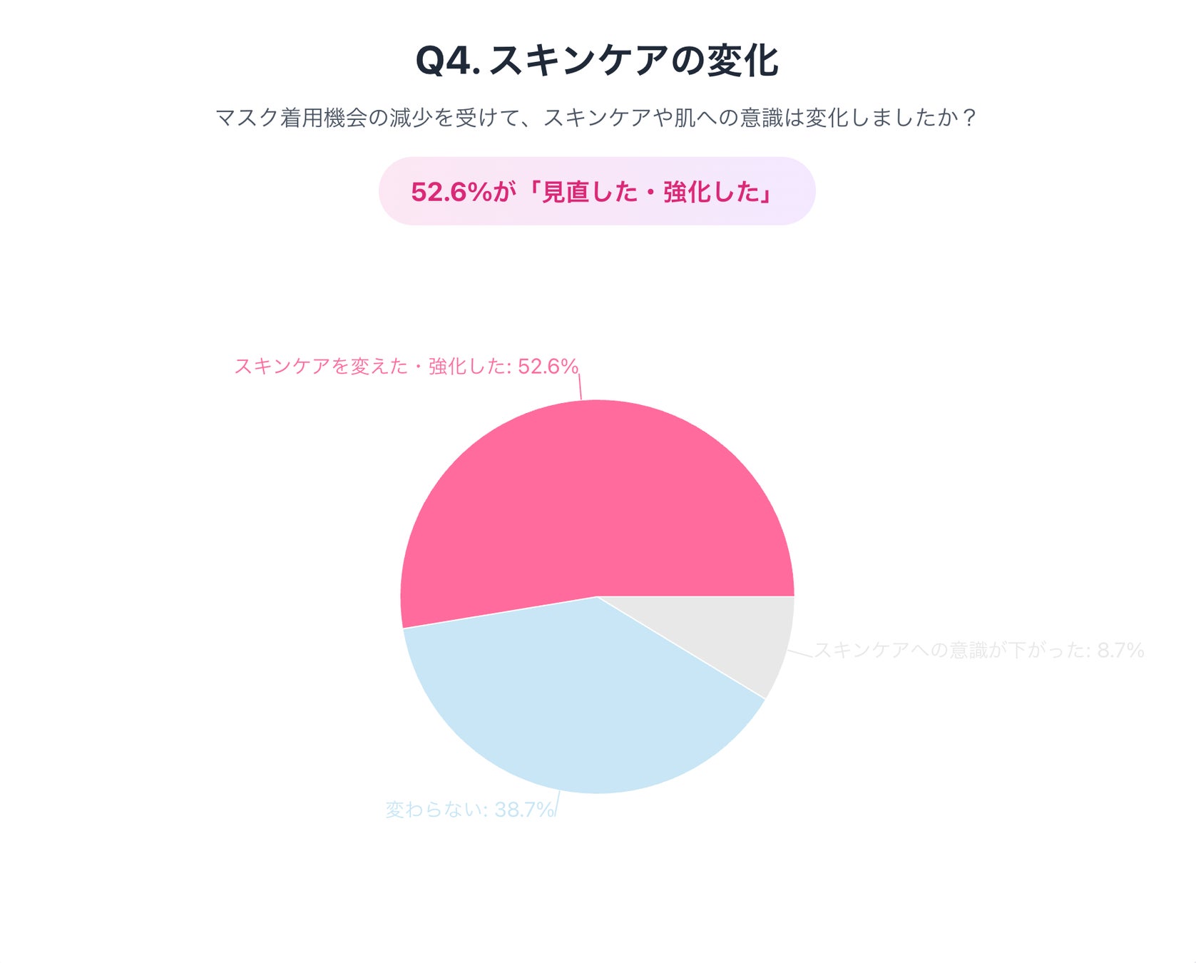 その結果、52.6%の方が「スキンケアを変えた・強化した」と回答し、マスクオフ時代に合わせて積極的に肌ケアを見直す人が増えていることが分かりました。