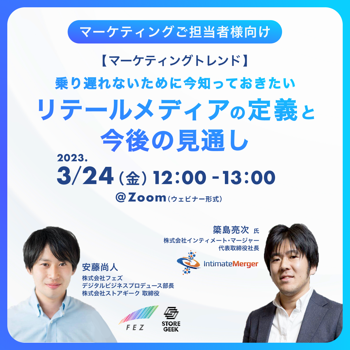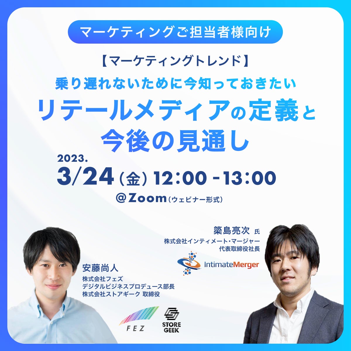 リテールDXを推進する株式会社フェズ(本社:東京都千代田区、代表取締役:伊丹 順平、以下フェズ)は、国内最大級パブリックDMPを提供するデータプラットフォームカンパニーの株式会社インティメート・マージャー(本社:東京都港区、代表取締役社長:簗島 亮次、以下インティメート・マージャー)と合同で無料オンラインセミナー「【マーケティングトレンド】乗り遅れないために今知っておきたいリテールメディアの定義と今後の見通し」を3月24日(金)12時00分より共催することをお知らせします。