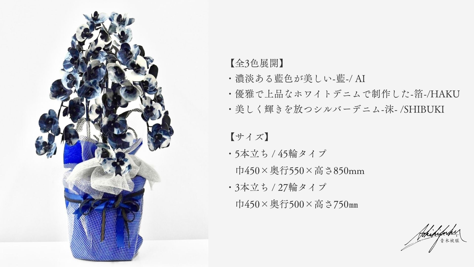 記念日だけでなく、人生の門出やお祝い事も含めて用いて頂きたいと思,制作に至りました。岡山の特産物でもあるデニムで制作しているため、色褪せる事無く、永遠に空間を彩る事が出来ます。「藍・箔・沫」の3色展開となっており、それぞれ3本タイプと5本タイプでの販売を青木被服オンラインストアにてスタート致しました。