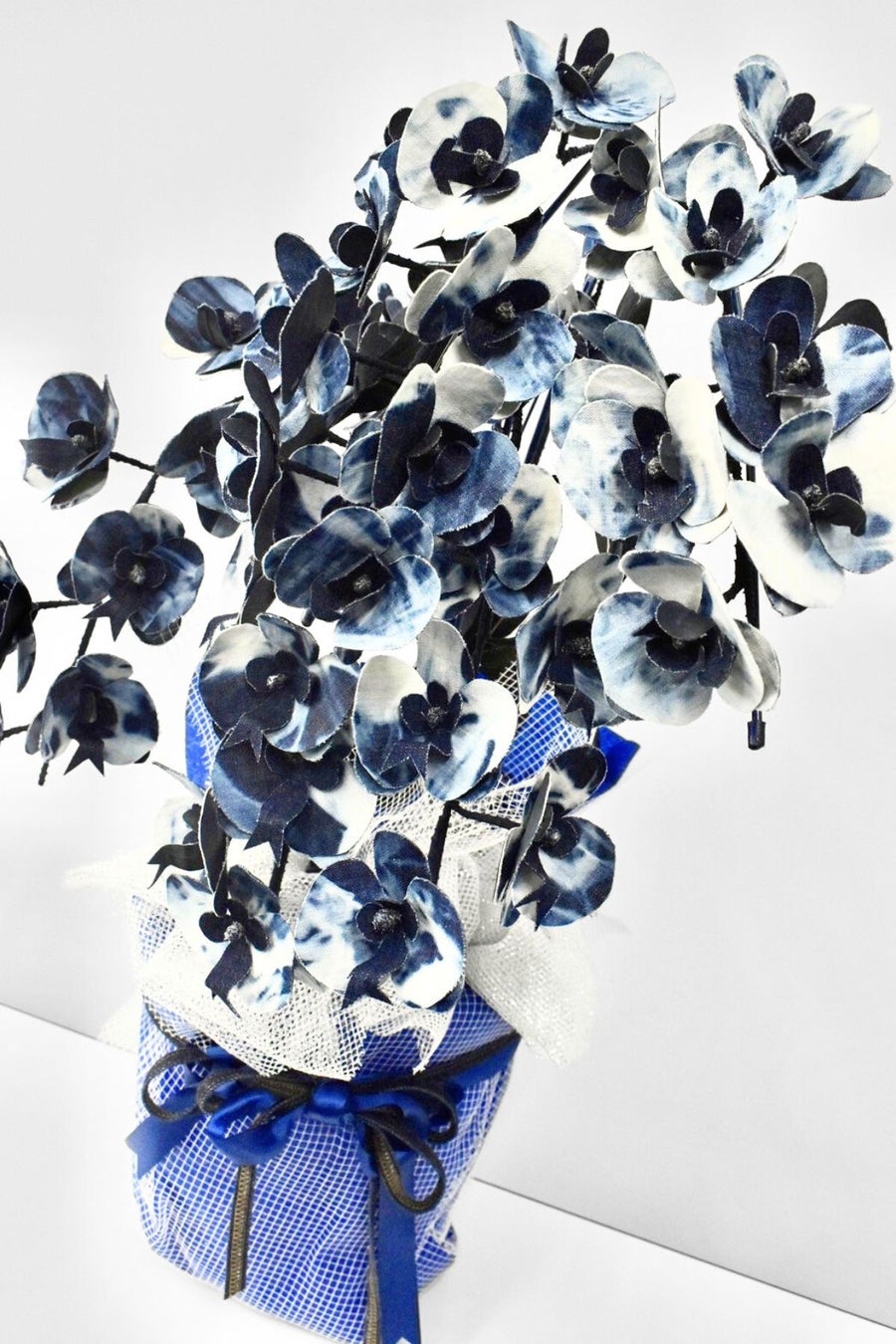 デニムにハンドブリーチを施し、濃淡ある藍色が美しいデニム胡蝶蘭の代表的カラーです。何色もの藍色が重なり、完成される藍色の光景は、1つたりとも同じもののない、「唯一無二」のテーマのもと制作いたしました。