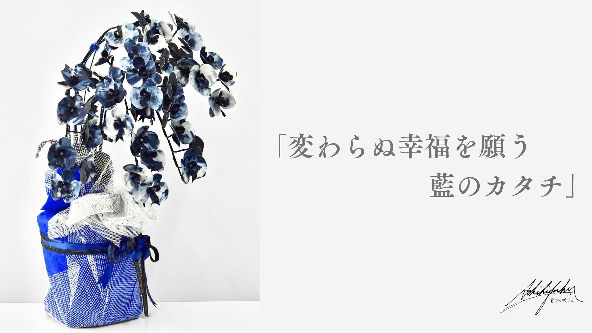 「デニム胡蝶蘭がついに完成しました。永遠に枯れない藍だからこそ、空間も永く彩る事が出来ます。華やかさと共に、岡山県を代表する新たな贈り物となればという思いです。」