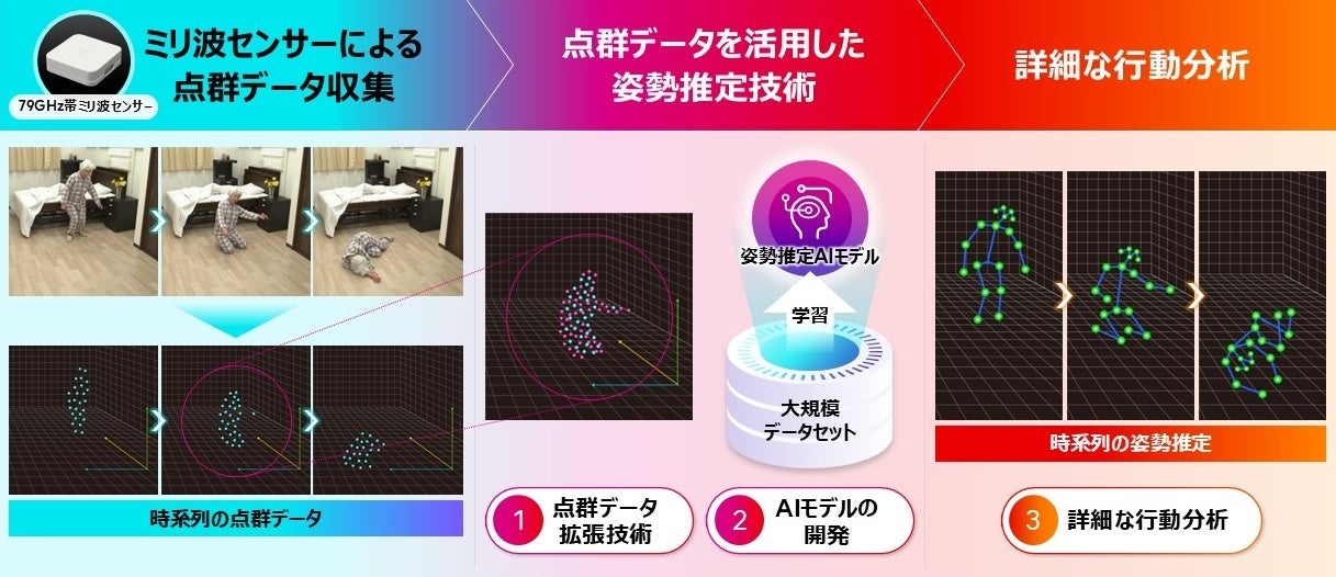 「meowave」は富士通のミリ波センサーを主要技術としています。ミリ波センサーは点群データから人の姿勢や動きを高精度で推定し、動作が検知されない場合でも心拍や呼吸といったバイタルデータを測定できます。この技術はカメラを用いないためプライバシーが保たれ、生活空間に溶け込む形で設置が可能。病院や介護施設をはじめとした様々な領域での活用が期待されています。