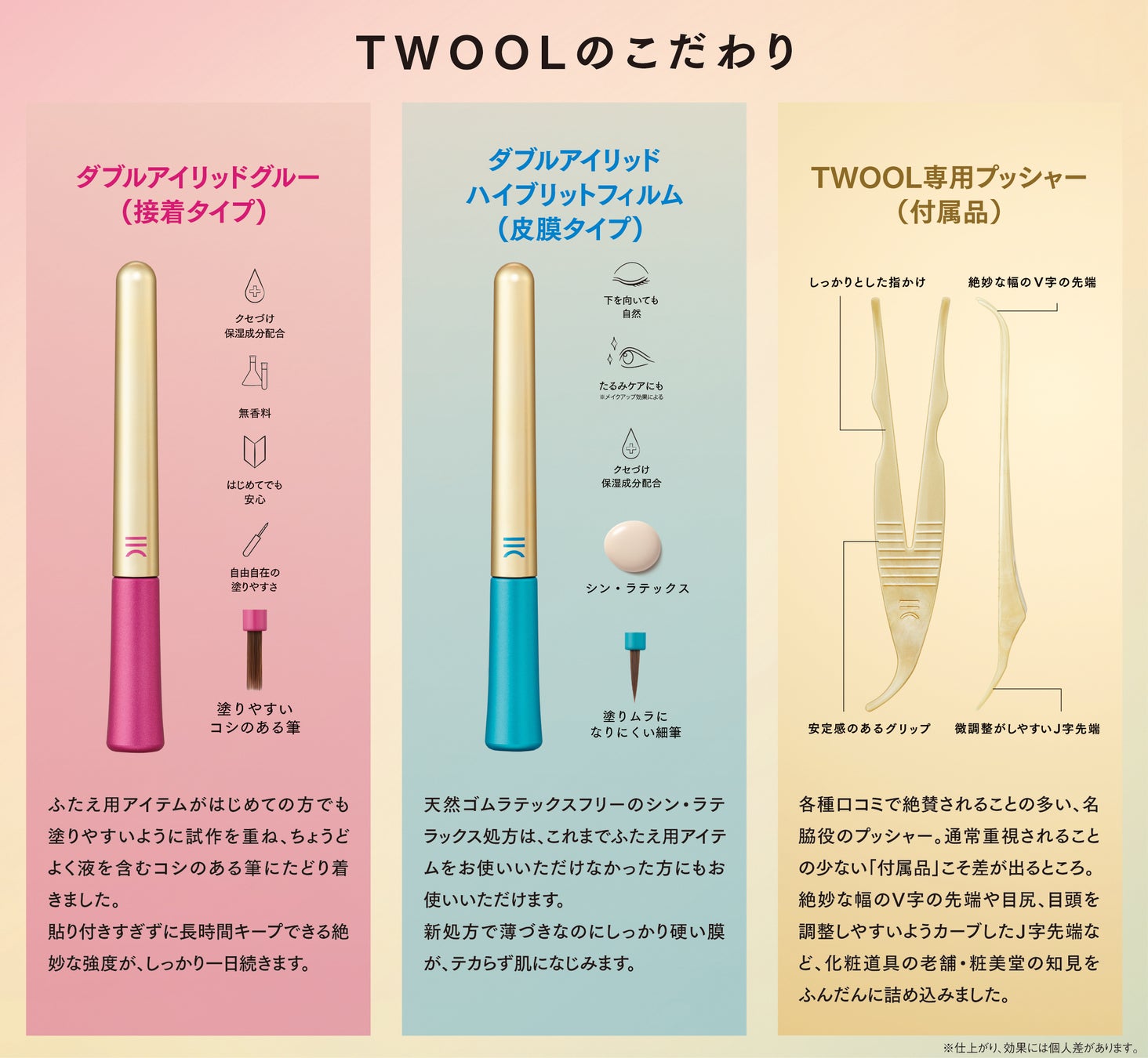 「TWOOL(トゥール)」は、「ふたえコスメ宣言」をコンセプトに、創業から73年、化粧道具を中心に「美に寄り添うモノづくり」を続けてきた粧美堂ならではのツールへのこだわりをふんだんに詰めこんだ新次元のふたえコスメです。