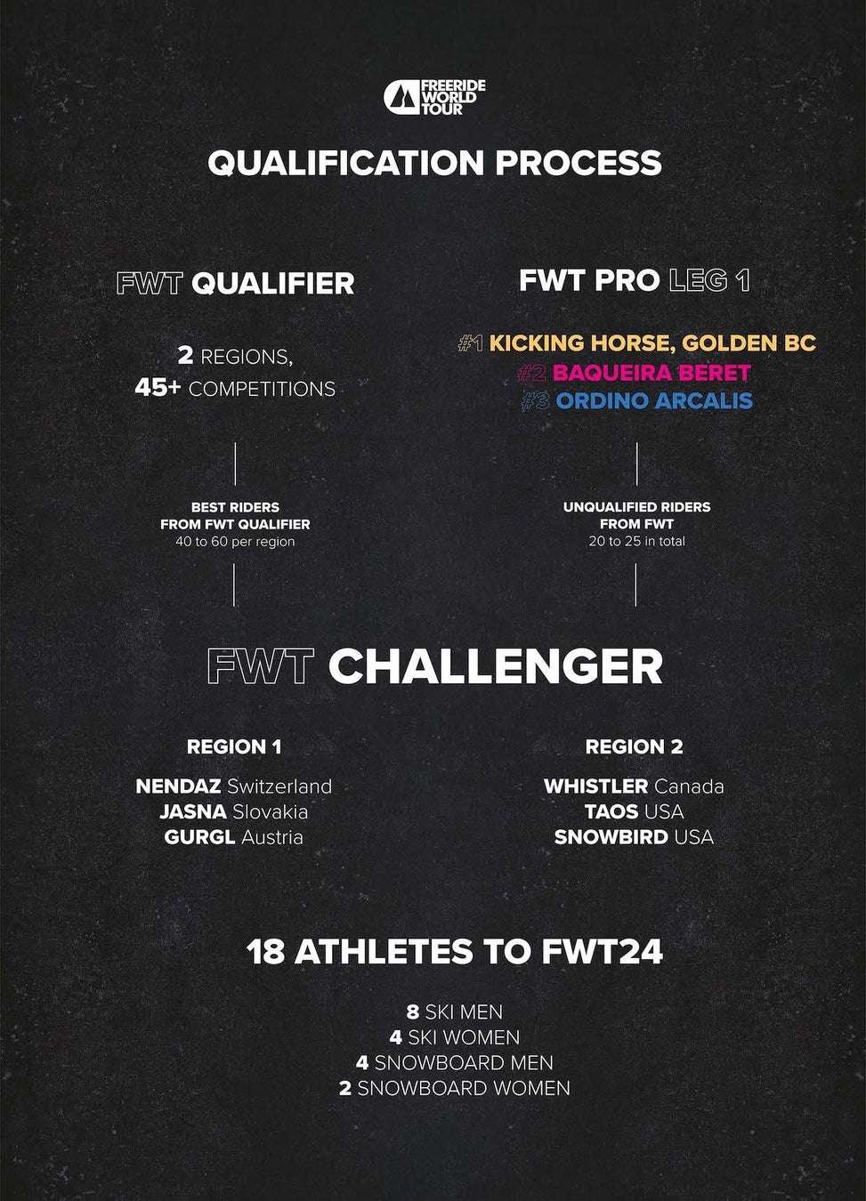 すべての大会が4階層のピラミッド構造になっており、18歳以上のライダーが出場できるFWT Qualifierで良い成績を残したベストアスリートはFWT Challengerに進み、前シーズンのFreeride World Tourで翌年のシード選手の基準順位に満たなかった選手と競います。特に優秀な限られたアスリートは、すべてのカテゴリからピラミッドの頂点であるFWTに進むチャンスがあります。
