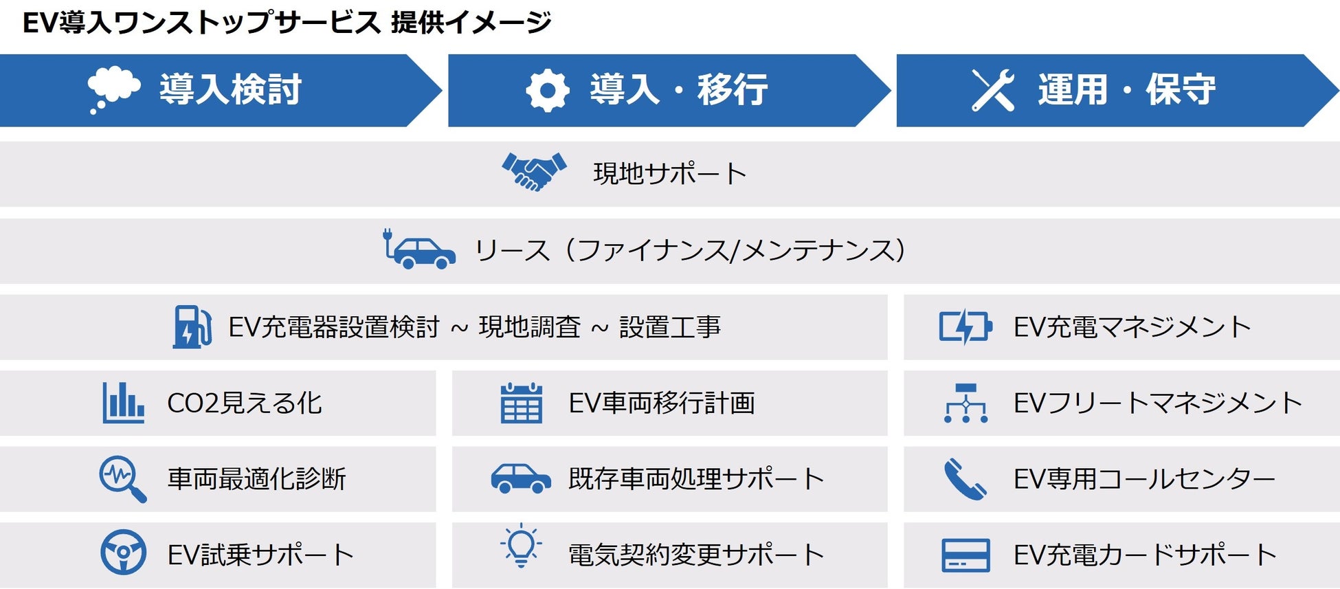 法人や自治体のお客さまのEV車両移行や運用の不安を3社で解決します。
