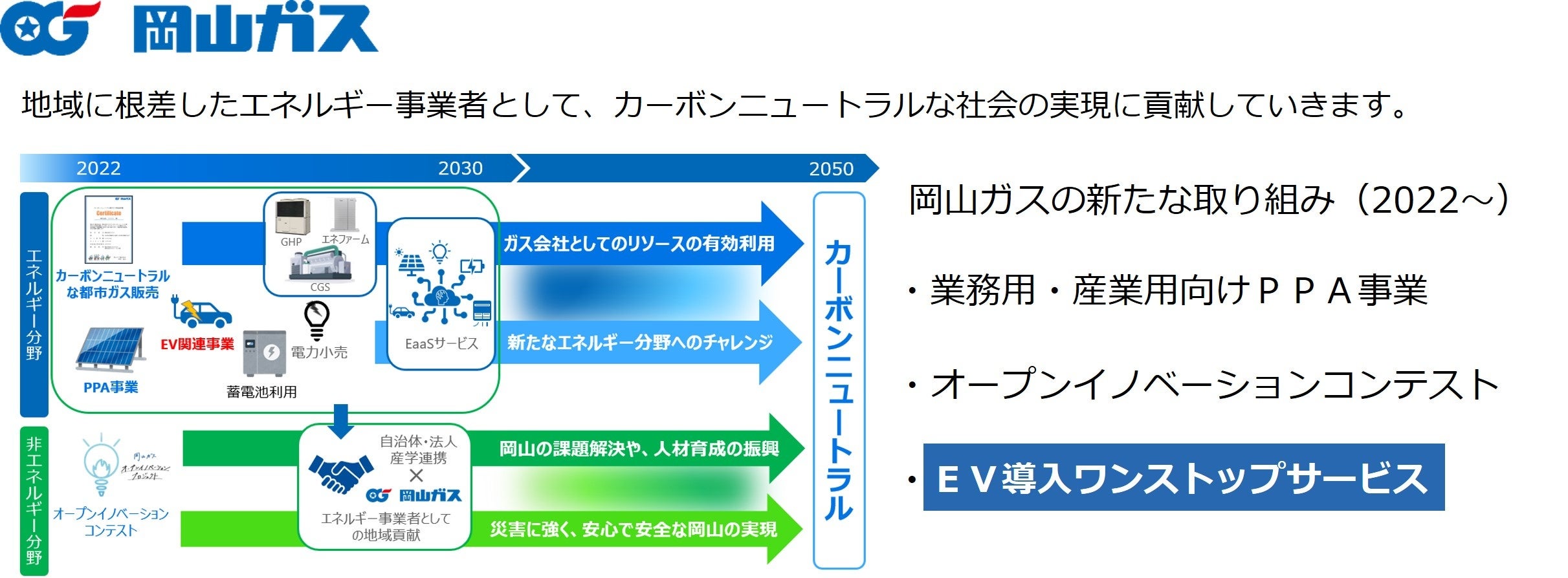 岡山県内の各市町村の取組みを受け、岡山ガスは脱炭素社会の実現と地域への貢献をすべくEV導入をパートナー企業と連携し推進することを決定いたしました。脱炭素の具体的な取組みの一つとして車両のEV化は必須であり、また移動する蓄電池として災害時のBCP対応にも利用できることから、EVを活用したエネルギーマネジメントを実施することで、岡山の皆さまと一緒に脱炭素という大きな課題にチャレンジしてまいります。
