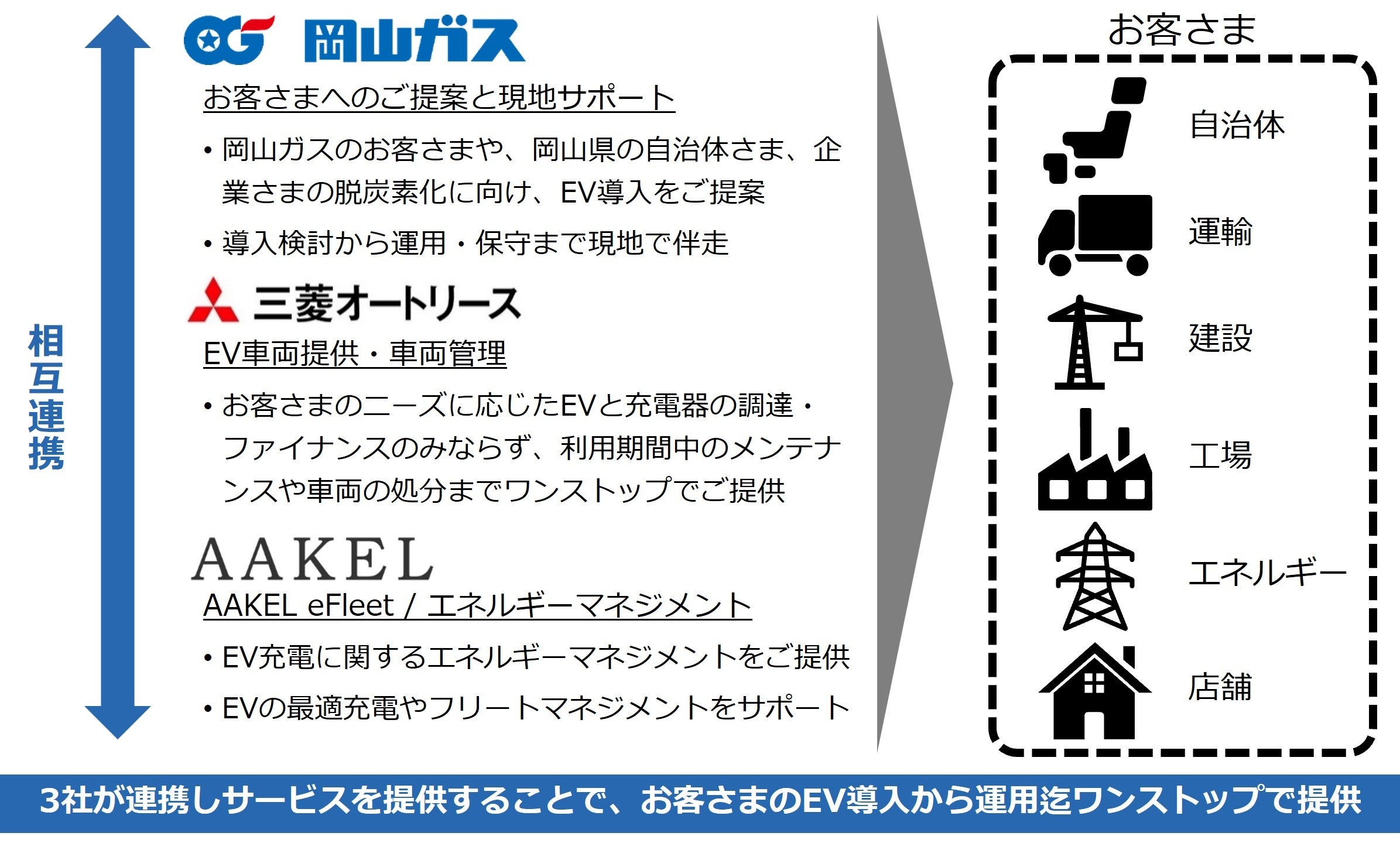 岡山ガス株式会社(本社:岡山県岡山市、代表取締役社長:岡﨑達也、以下「岡山ガス」)と、三菱オートリース株式会社(本社:東京都港区、代表取締役社長:中野智、以下「三菱オートリース」)と、アークエルテクノロジーズ株式会社(本社:福岡県福岡市、代表取締役社長:宮脇良二、以下「AAKEL」)は、2023年4月より、EV導入ワンストップサービスを3社協業事業として開始します。
