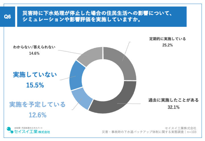 「Q6. 災害時に下水処理が停止した場合の住民生活への影響について、シミュレーションや影響評価を実施していますか。」(n=103)と質問したところ、「実施を予定している」が12.6%、「実施していない」が15.5%という回答となりました。