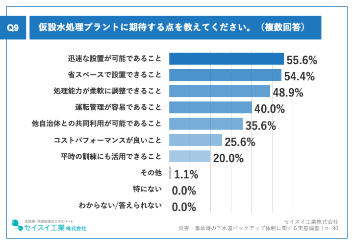 「Q9. Q8で「非常にそう思う」「ややそう思う」と回答した方にお聞きします。仮設水処理プラントに期待する点を教えてください。(複数回答)」(n=90)と質問したところ、「迅速な設置が可能であること」が55.6%、「省スペースで設置できること」が54.4%、「処理能力が柔軟に調整できること」が48.9%という回答となりました。