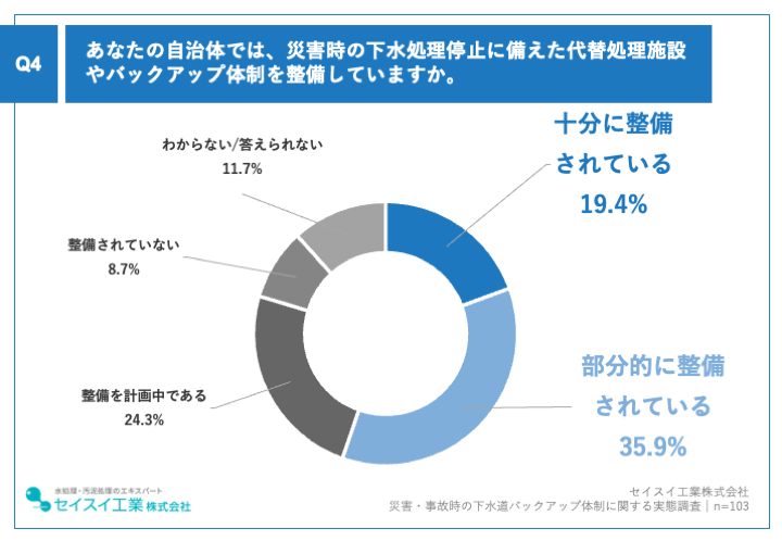 「Q4. あなたの自治体では、災害時の下水処理停止に備えた代替処理施設やバックアップ体制を整備していますか。」(n=103)と質問したところ、「十分に整備されている」が19.4%、「部分的に整備されている」が35.9%という回答となりました。