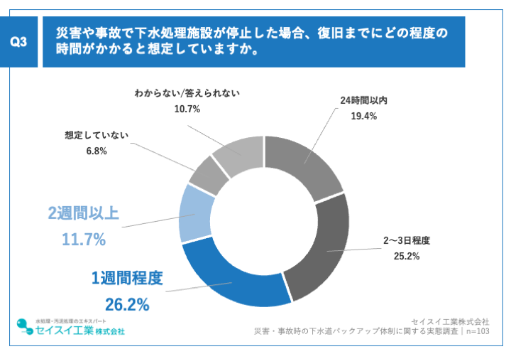 「Q3. 災害や事故で下水処理施設が停止した場合、復旧までにどの程度の時間がかかると想定していますか。」(n=103)と質問したところ、「1週間程度:が26.2%、「2週間以上」が 11.7%という回答となりました。