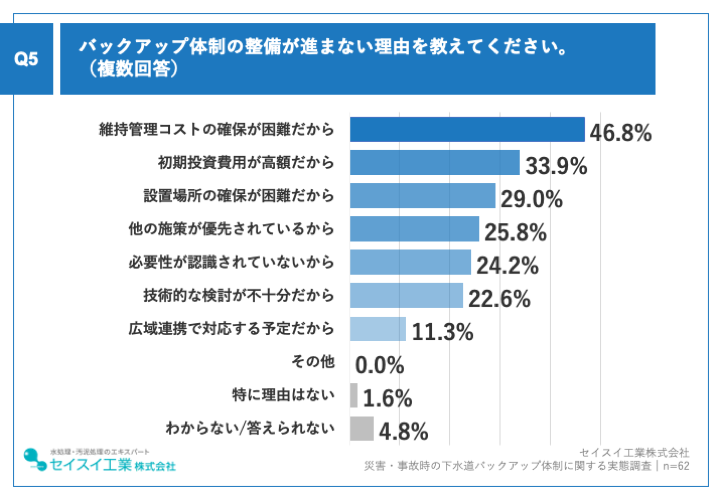 「Q5. Q4で「整備を計画中である」「整備されていない」と回答した方にお聞きします。バックアップ体制の整備が進まない理由を教えてください。(複数回答)」(n=62)と質問したところ、「維持管理コストの確保が困難だから」が46.8%、「初期投資費用が高額だから」が33.9%、「設置場所の確保が困難だから」が29.0%という回答となりました。