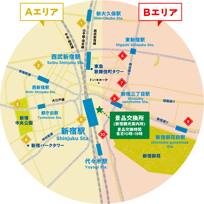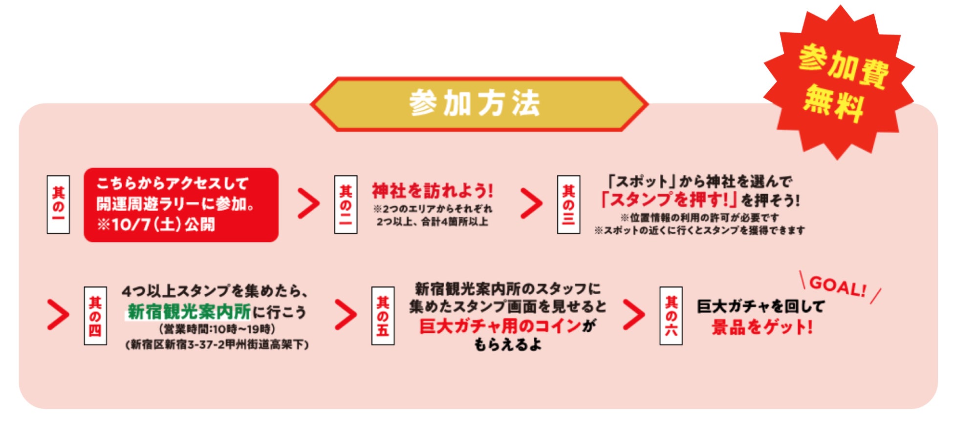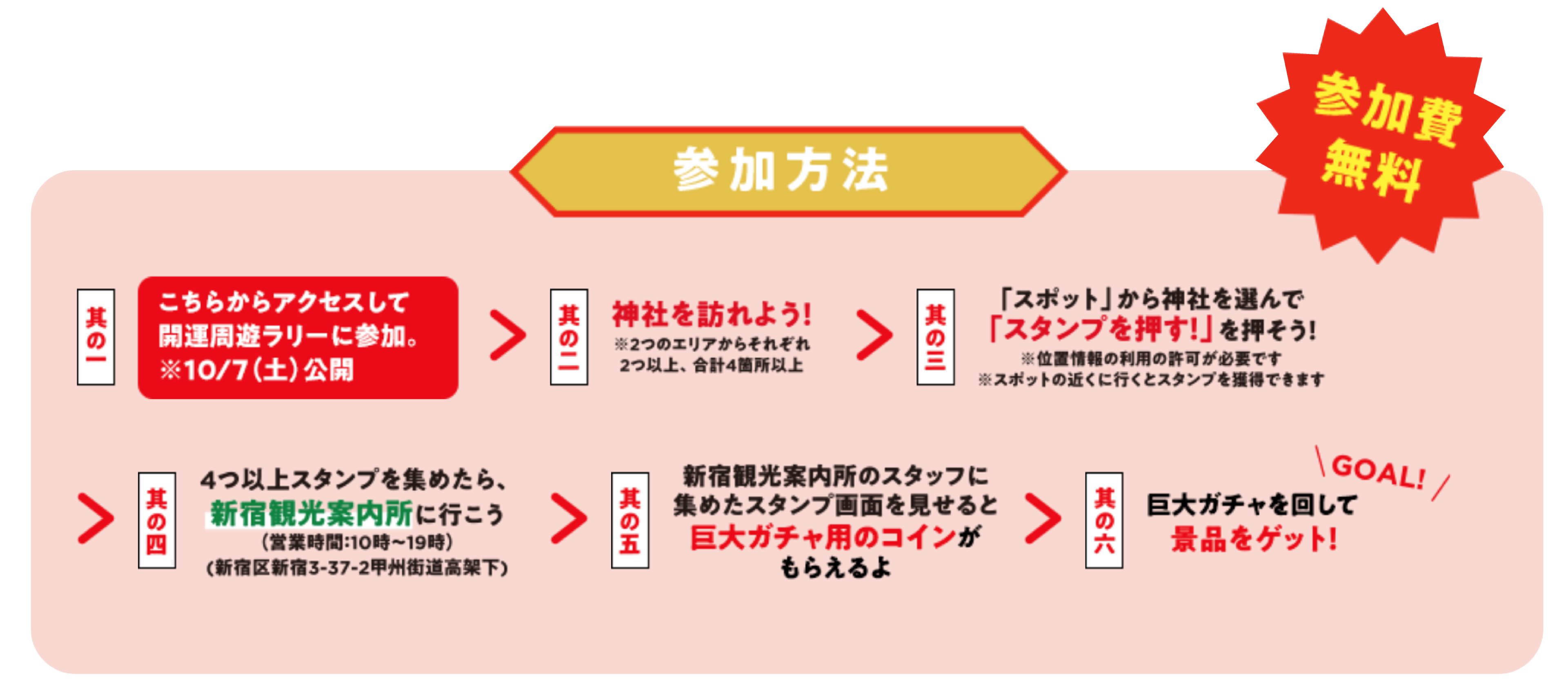 2023年10月7日(土)~22日(日)新宿駅周辺10神社の東西2つのエリアからそれぞれ2つの神社を選んで巡り4つ以上のスタンプを集めて新宿観光案内所内の巨大ガチャに挑戦し景品をGETしよう!
