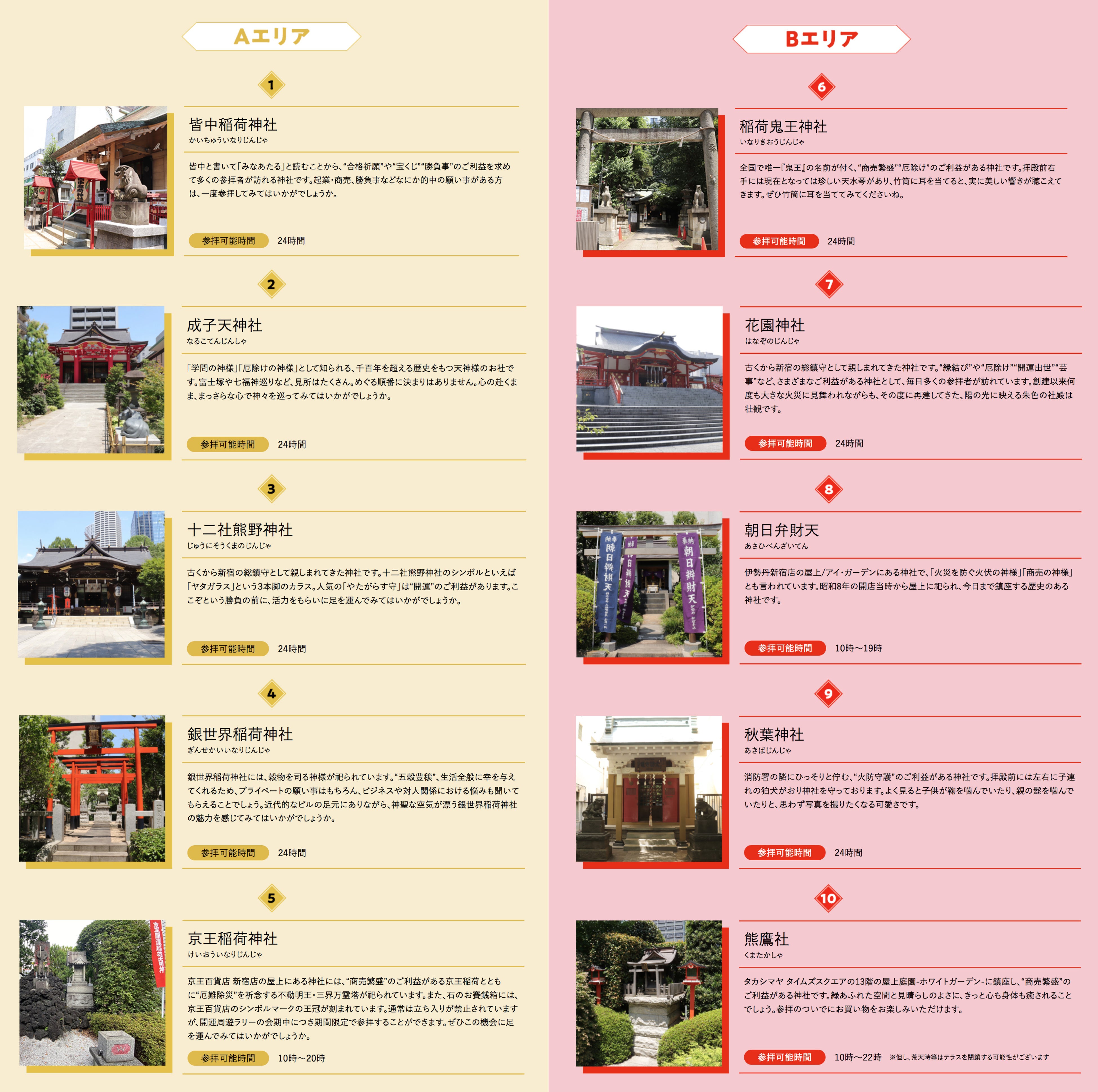 新宿駅周辺10神社(秋葉神社、朝日弁財天、稲荷鬼王神社、皆中稲荷神社、銀世界稲荷神社、熊鷹社、京王稲荷神社、十二社熊野神社、成子天神社、花園神社)