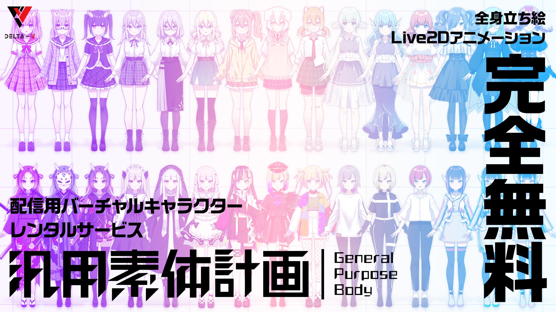 株式会社DELTA-Vでは法人及び個人向けに配信用バーチャルキャラクターレンタルサービス「汎用素体計画(はんようそたいけいかく)」を提供中。株式会社DELTA-Vがオーガナイザー機能を有するライブ配信プラットフォーム等において、”無料”でキャラクター全身立ち絵とLive2Dモデルをご利用できるサービスとなります。